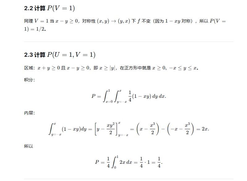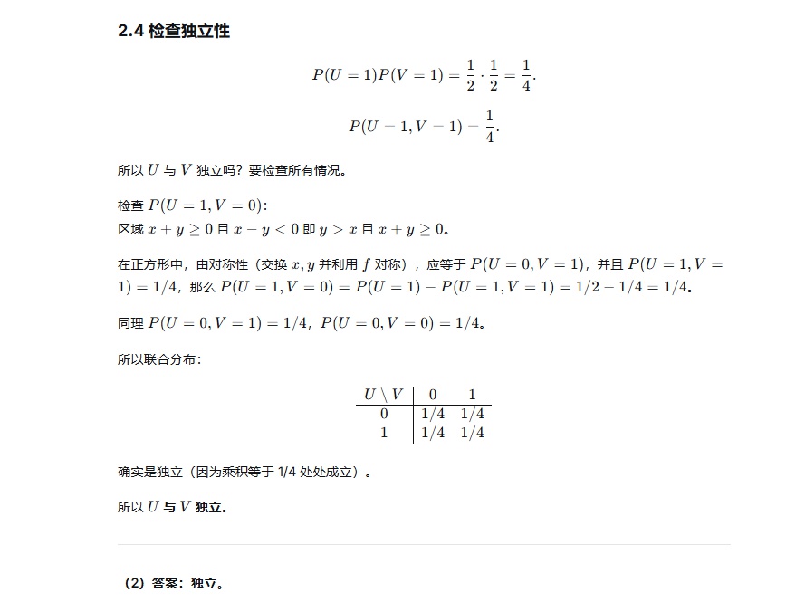 - 正确计算了(U,V)的联合分布,得到P(U=0,V=0)=1/4,P(U=0,V=1)=1/4,P(U=1,V=0)=1/4,P(U=1,V=1)=1/4