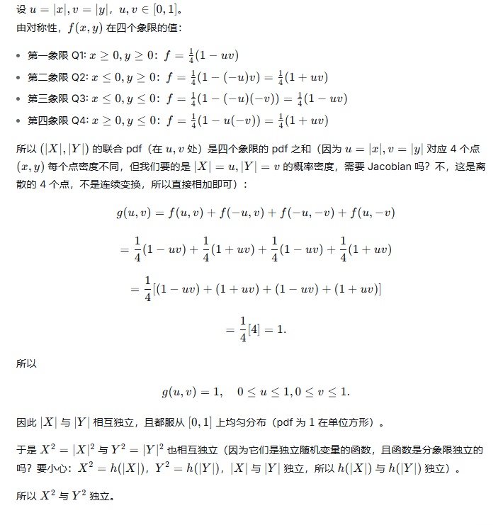 - 通过计算|X|和|Y|的联合分布,得到g(u,v)=1,证明|X|与|Y|相互独立