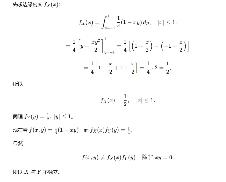 - 正确计算了X和Y的边缘概率密度,得到f_X(x)=1/2,f_Y(y)=1/2