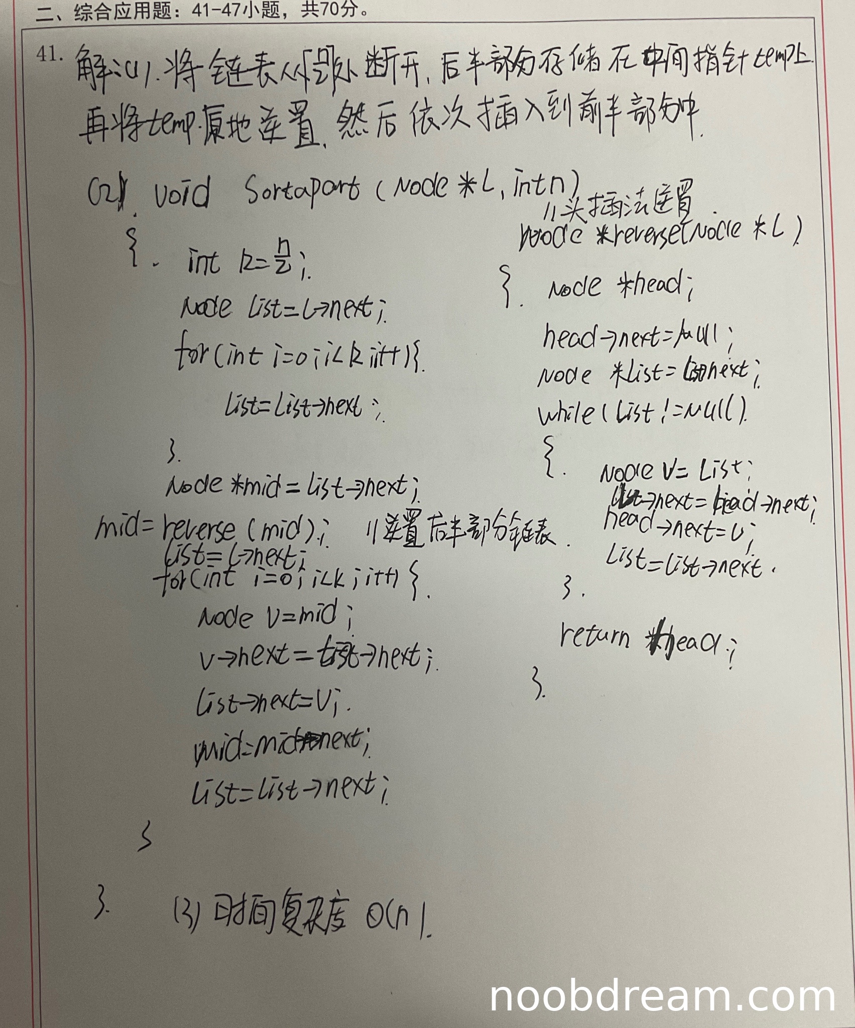 学生答案的基本设计思想与标准答案一致:将链表从中间断开,反转后半部分,然后合并。思路正确,表述清晰。得3分。