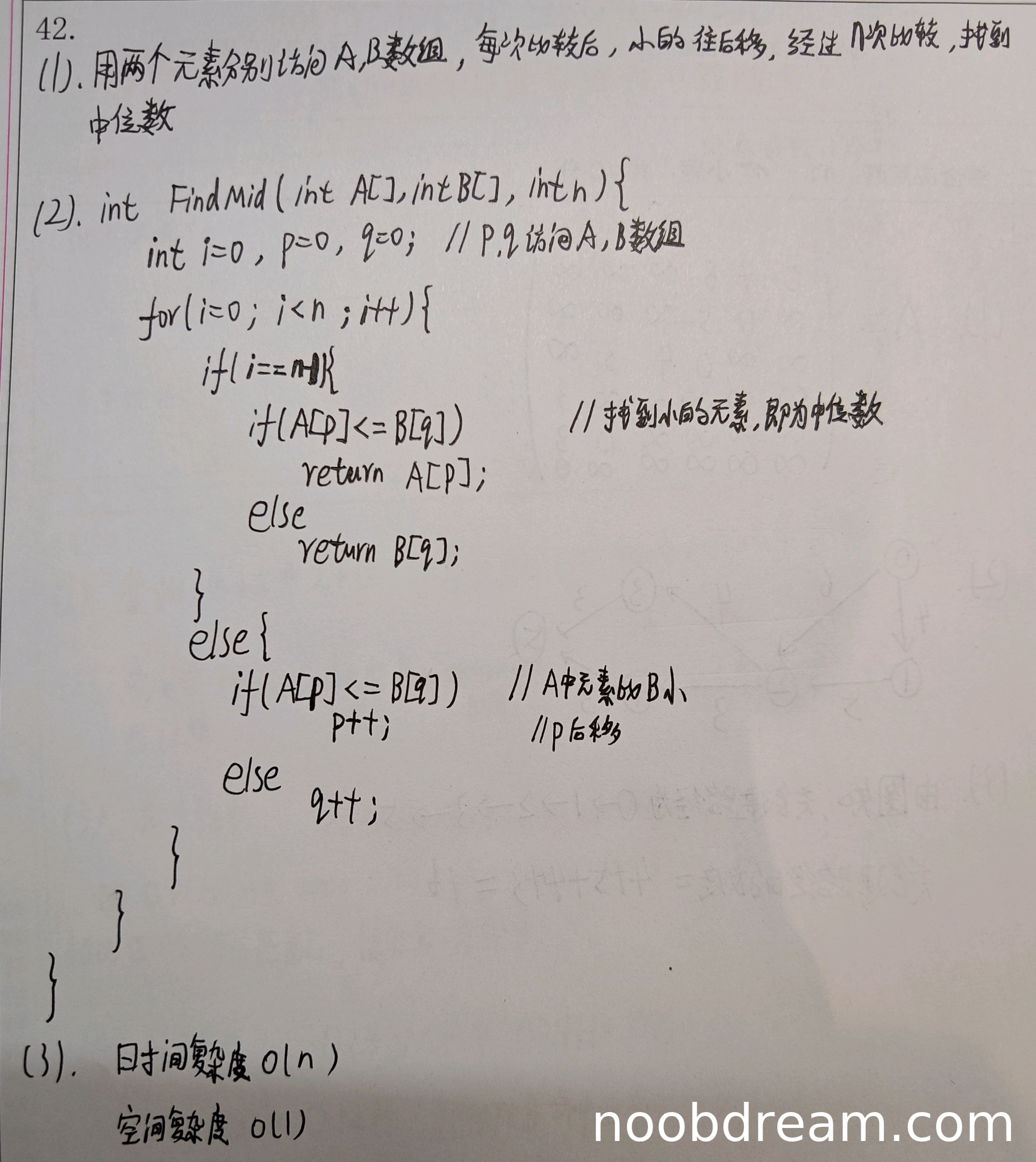 理由:学生的设计思想是使用双指针分别遍历两个数组,每次比较后移动较小值的指针,经过n次比较后找到中位数。这种方法实际上是在模拟合并两个有序数组的过程,但题目要求的是两个升序序列的中位数,根据定义应该是合并后序列的第n个元素(因为总长度为2n,中位数是第n个)。学生的算法在循环n次后返回的实际上是第n小的元素,这个思路是正确的。但是标准答案采用的是更高效的二分查找思想,时间复杂度为O(log n)。虽然学生的思路正确,但题目要求"在时间和空间两方面都尽可能高效的算法",学生的O(n)解法不如标准答案的O(log n)高效,但根据评分规则"思路正确不扣分",这里应该给满分。不过仔细分析发现,学生的描述"经过n次比较,找到中位数"确实正确,因此应得4分。