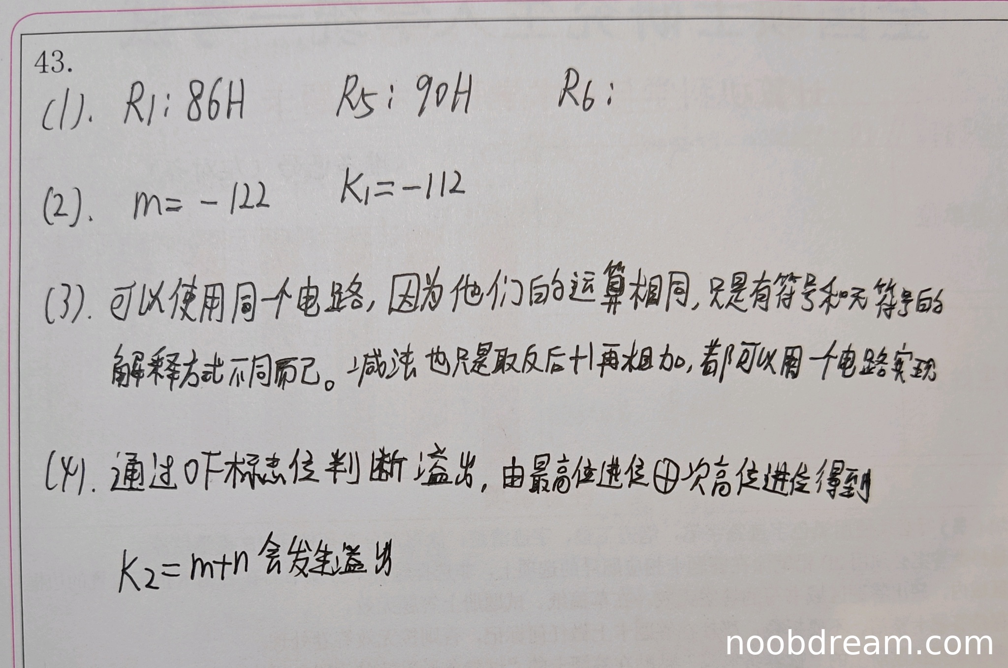 学生正确指出可以使用同一个电路实现,理由描述准确(运算相同,解释方式不同,减法通过取反加一实现)。与标准答案核心观点一致,得2分。