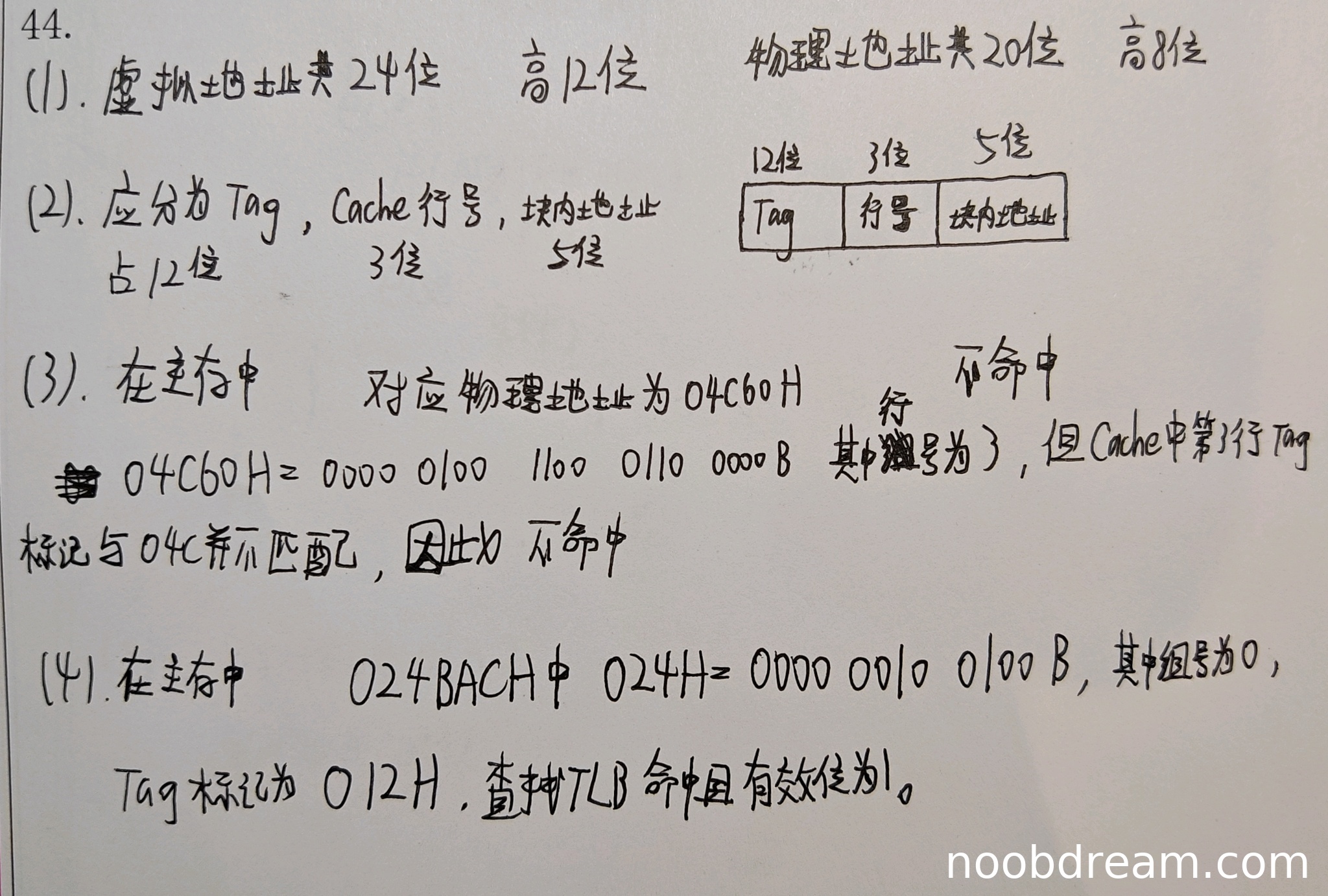 学生答案基本正确:判断虚拟地址001C60H在主存中,对应物理地址为04C60H,且Cache不命中,理由正确(行号为3,但标记不匹配)。但标准答案中标记为064H≠04CH,学生写作“04C”可能是简写或识别误差,不影响核心逻辑,因此不扣分。得4分。