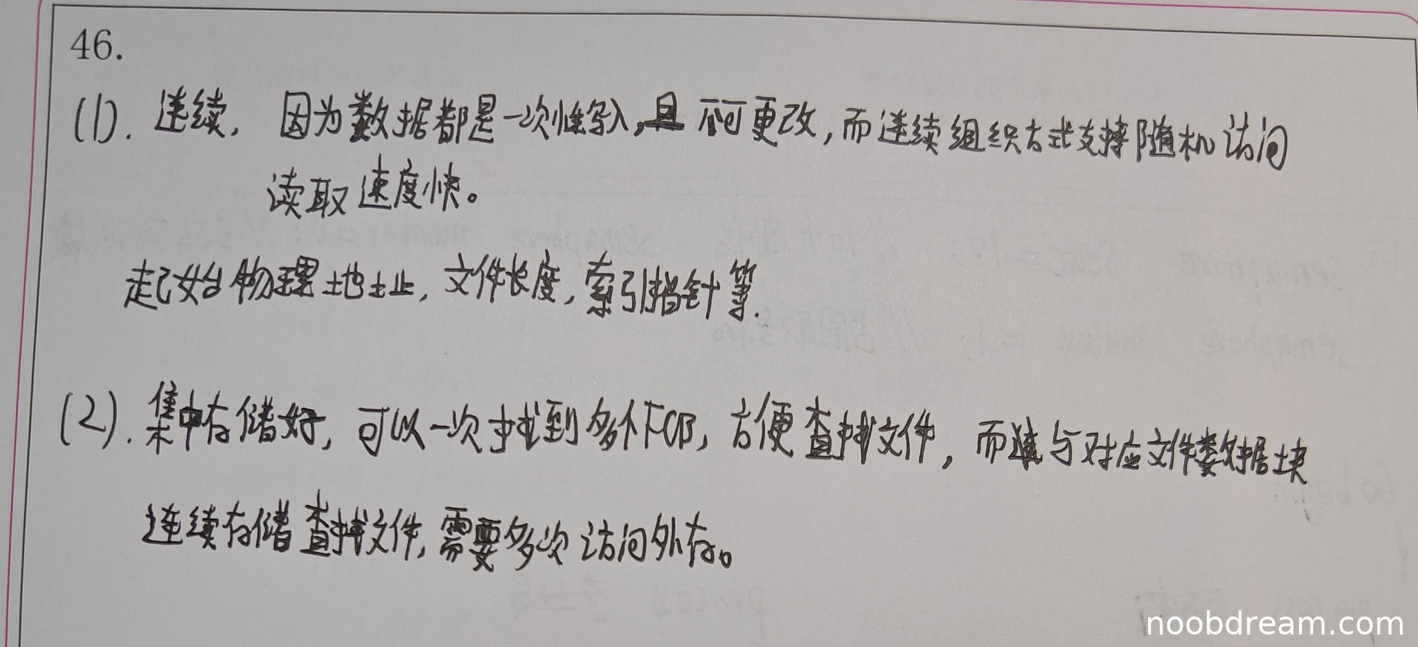 学生第一问中选择了"连续"文件组织方式,理由正确(一次性写入、不可修改、随机访问读取速度快),与标准答案一致,得2分。第二问中,学生回答"起始物理地址,文件长度,索引指针等",其中"起始物理地址"对应标准答案的起始块号,"文件长度"可对应块数,但"索引指针"在连续分配中不必要,属于多余信息。根据评分规则,多余信息不扣分,但核心字段描述基本正确。因此第二问得2分。本小题总计得4分。