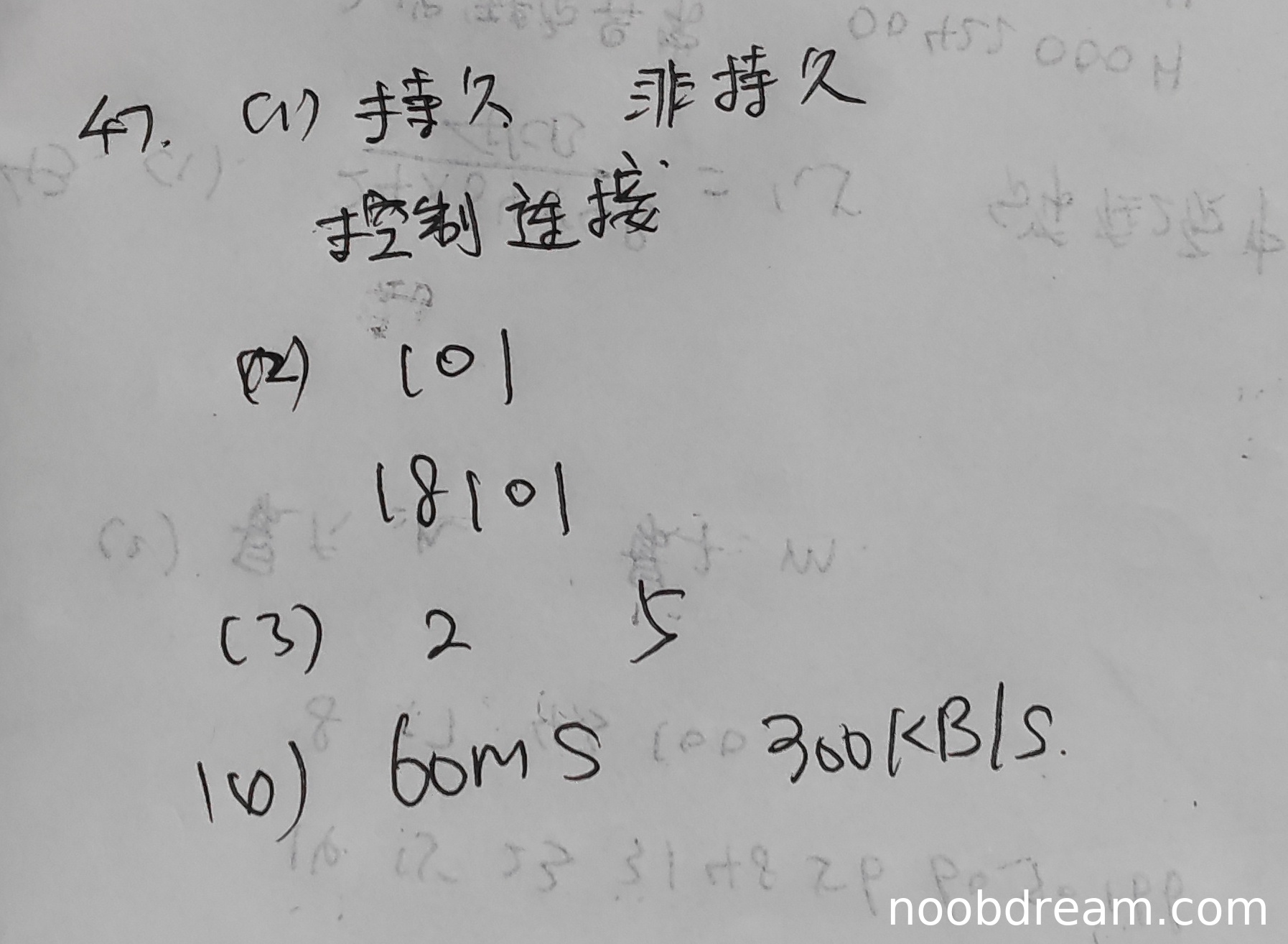 评分:时间60ms正确,得1分;速率300KB/s(约2.4Mbps)正确,得1分。本题得2分。