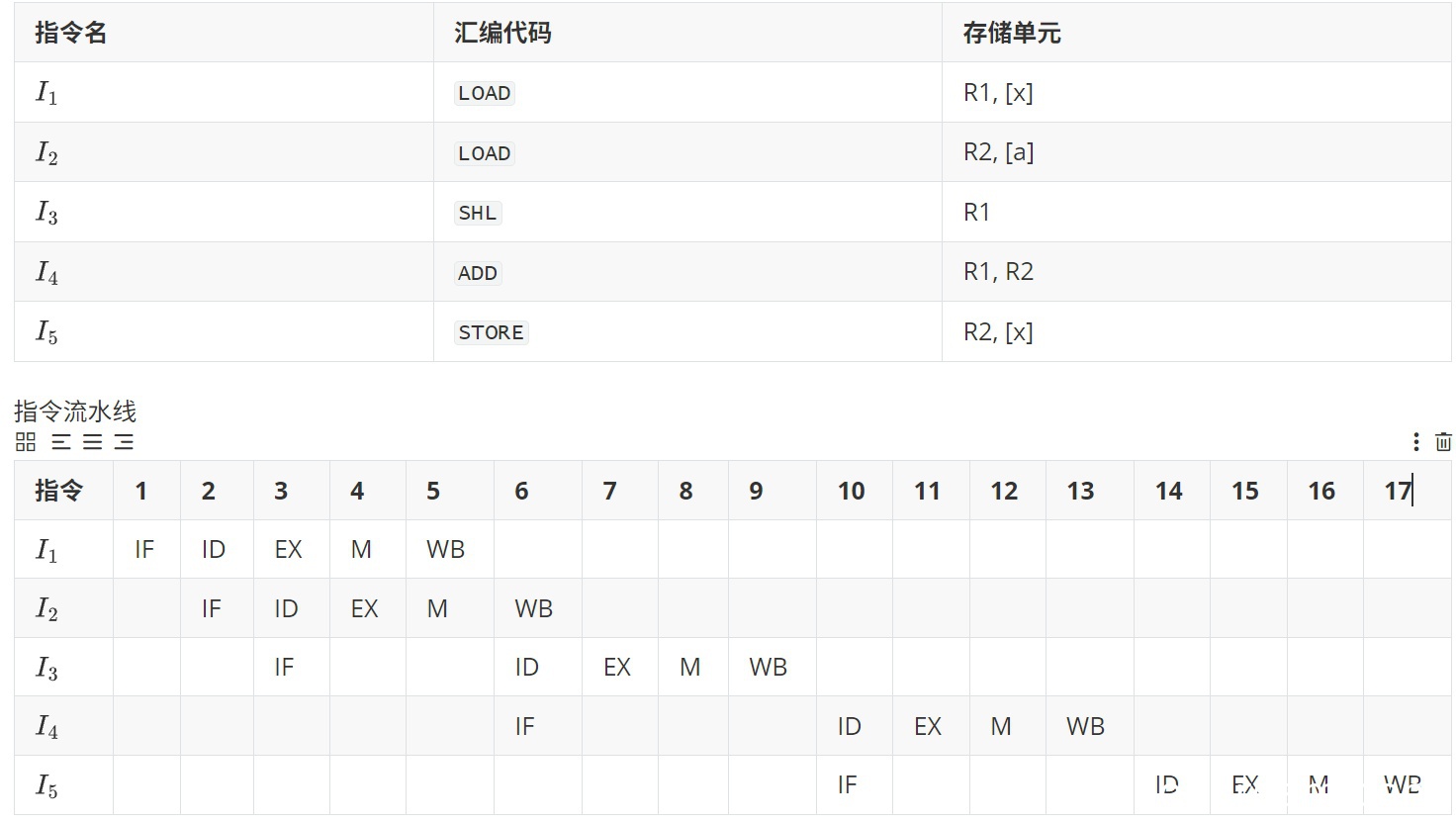 因为 I3 与 “I1 和 I2“ 都存在数据冒险,需等到 I1 和 I2 将结果写回寄存器后,I3 才能读寄存器内容,所以 I3 段的ID阻塞了两个时钟周期;因为 I4 的前一条指令 I3 在 ID 段被阻塞,I3 还没来得及锁寄存器 IR,流水段寄存器的数据尚未取完,倘若此时 I4 要执行 IF,那么 I3 拿到的是 I4 的译码结果,会覆盖 I3 的指令,所以 I4 的 IF 段被阻塞