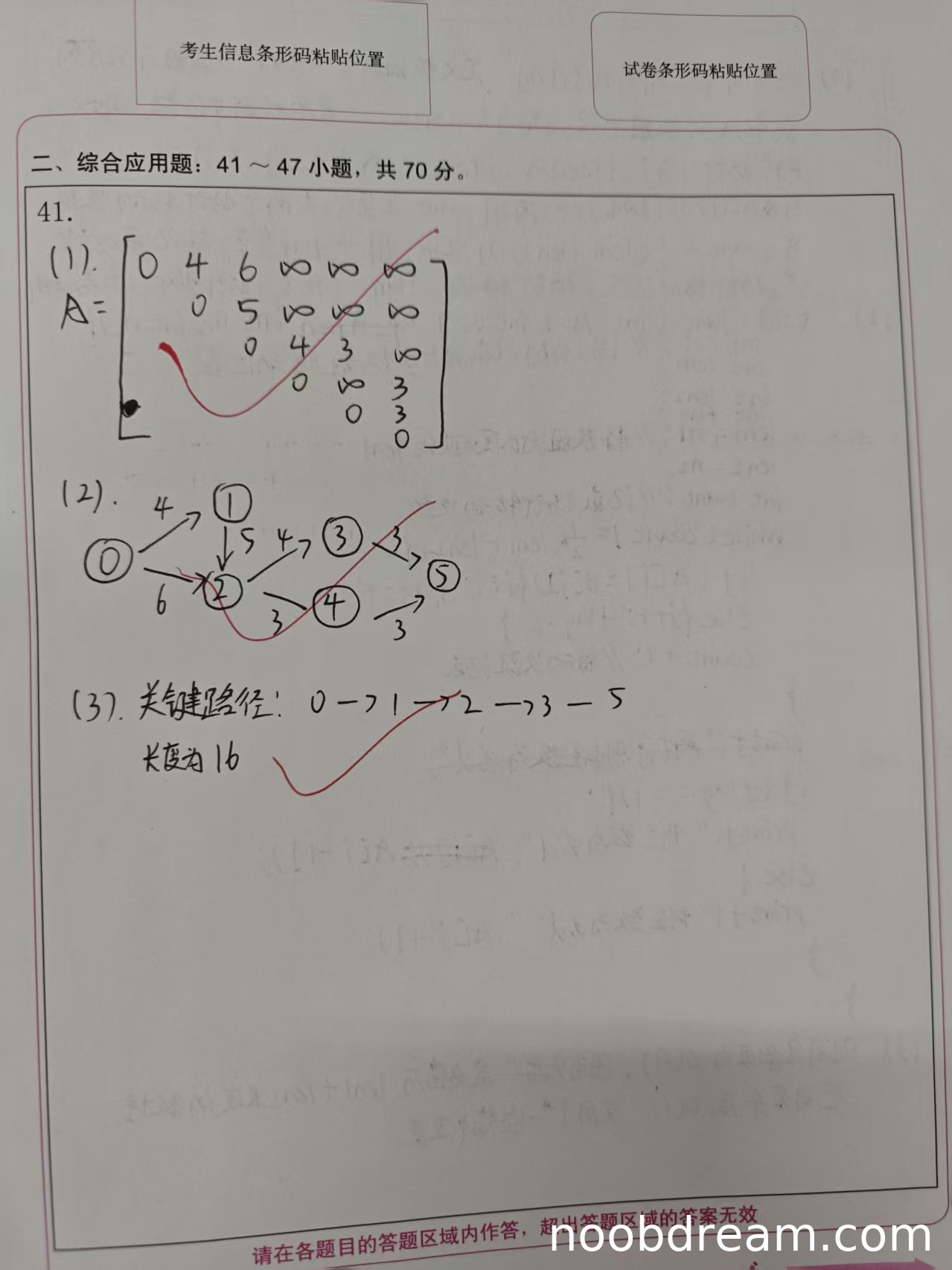 学生正确找到了关键路径0→1→2→3→5,并计算出长度16,与标准答案一致。得4分。