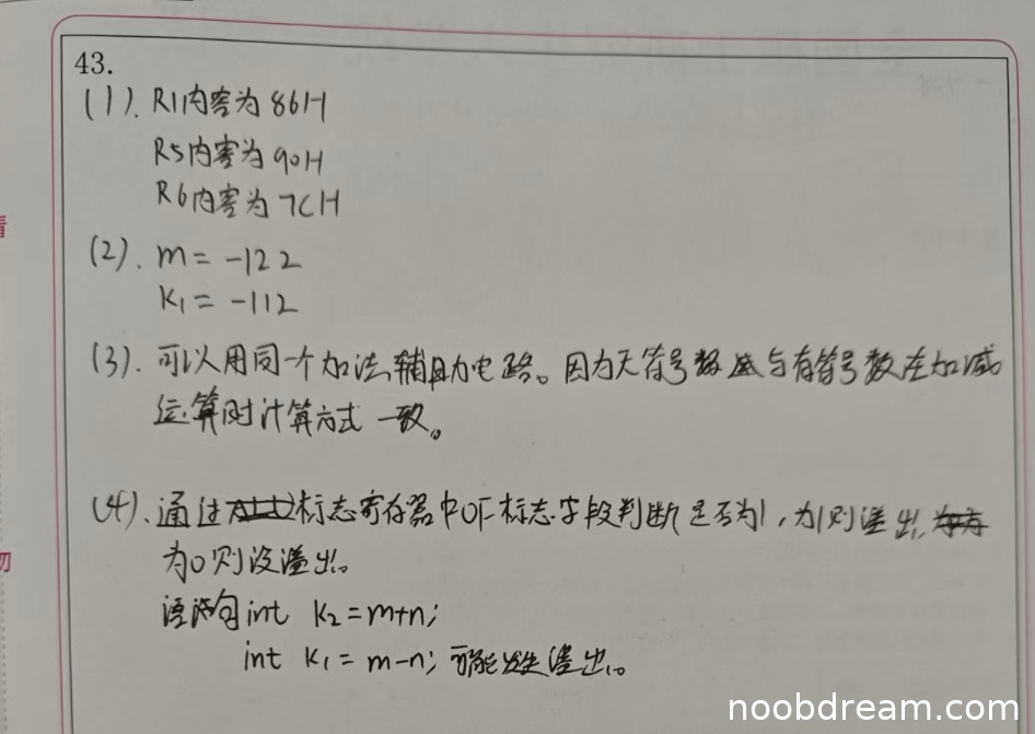学生答案指出通过标志寄存器中OF标志字段判断溢出,这是正确的判断方法之一。但在具体溢出语句判断上,学生认为"int k1 = m - n;可能发生溢出"是不正确的,根据计算m-n=-122-(-10)=-112,在8位有符号数表示范围(-128~127)内,不会溢出。学生正确指出了"int k2 = m + n"会溢出(-122+(-10)=-132<-128,确实溢出),但由于多指出了一个不会溢出的语句,扣1分。得2分。