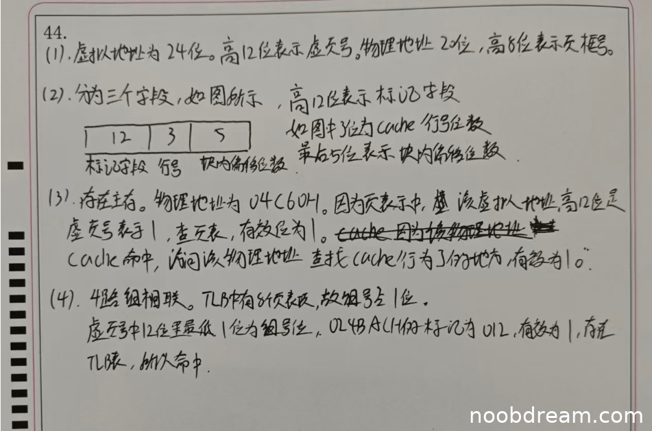 学生正确判断虚拟地址001C60H在主存中,并给出物理地址04C60H,理由正确(虚页号1查页表有效位为1,页框号04H)。但在Cache命中判断中,学生称“Cache命中”,而标准答案为不命中,因为标记位064H≠04CH。此处逻辑错误,扣2分。得2分。