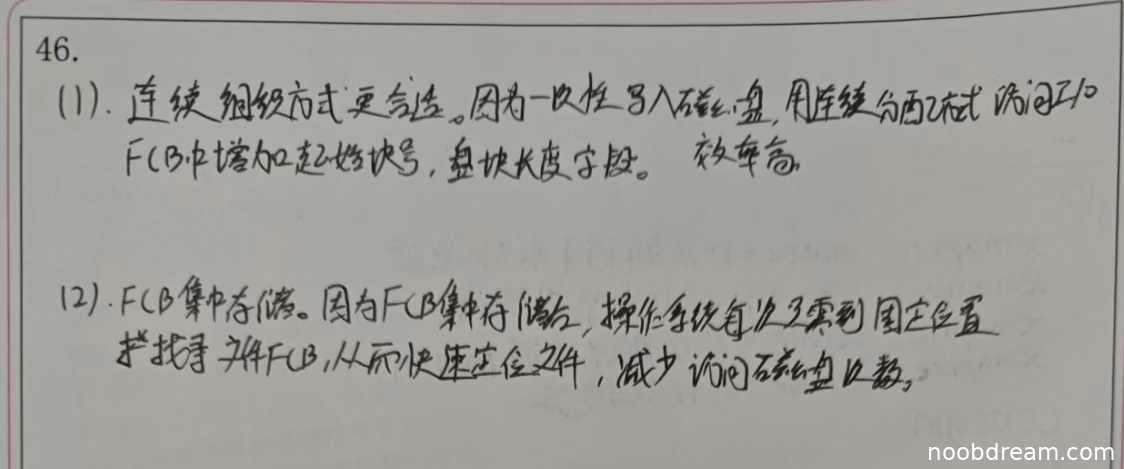 学生答案正确选择了FCB集中存储,理由(减少访问磁盘次数)与标准答案的核心观点一致。虽然表述不如标准答案详细,但核心逻辑正确。因此本小题得3分。
