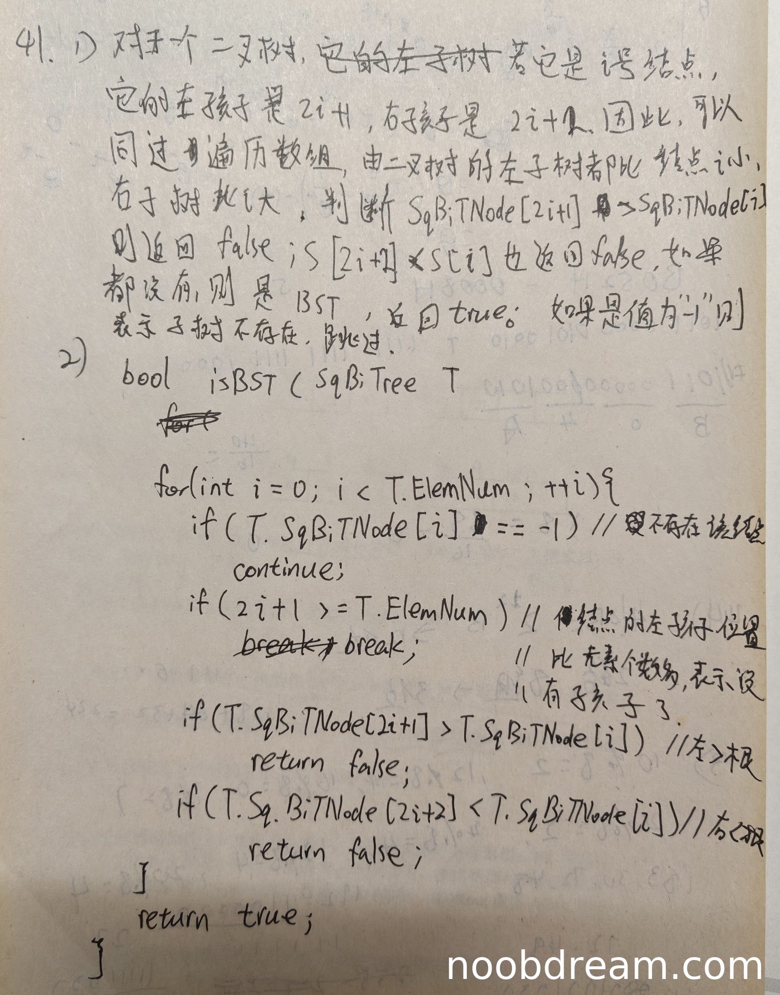 学生答案的基本设计思想是:通过遍历数组,对每个非空结点检查其左孩子(2i+1位置)是否大于当前结点值,以及右孩子(2i+2位置)是否小于当前结点值,如果满足任一条件则返回false,否则返回true。这种方法试图利用二叉搜索树的性质(左子树所有结点值小于根结点,右子树所有结点值大于根结点)。