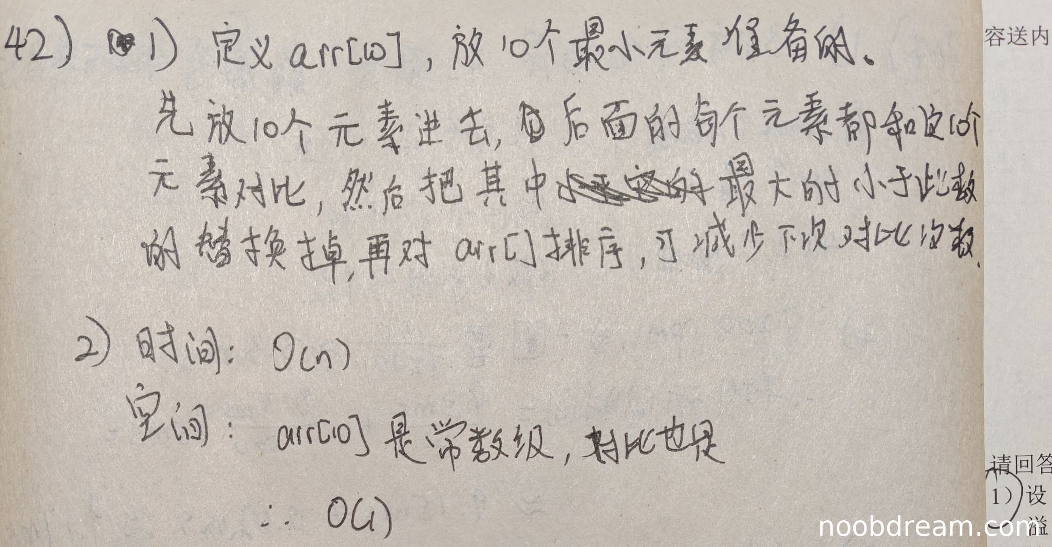 理由:学生答案描述了一个维护最小10个数的算法思想,即使用一个大小为10的数组,先放入10个元素,然后对后续每个元素进行比较,如果小于数组中的最大值则替换并重新排序。这与标准答案中的方法一(插入排序思想)基本一致,思路正确。但学生答案中"把其中最大的小于此数的替换掉"表述存在逻辑不清晰的问题,应为"如果新元素小于当前数组中的最大值,则替换最大值并重新排序",这里存在轻微的逻辑表述不准确,扣1分。