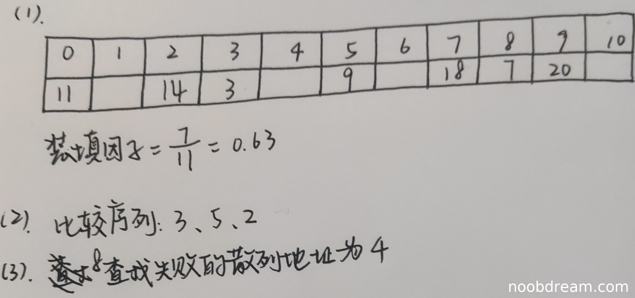 学生给出的散列表内容为:地址0:11,地址2:14,地址3:3,地址5:9,地址7:18,地址8:7,地址9:20。与标准答案对比,地址8应为9(学生写为7),地址10应为7(学生未填写,为空)。此外,装填因子计算为7/11≈0.63,正确。散列表内容有部分错误,但装填因子正确。扣分:散列表内容错误(地址8和地址10的值错误)扣2分,装填因子正确不扣分。得分:4分。