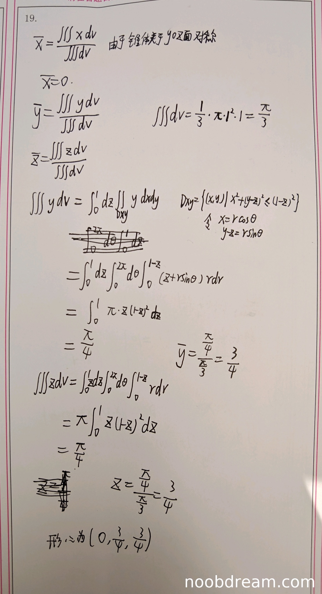 学生最终得出形心坐标为\((0,\frac{3}{4},\frac{3}{4})\),但标准答案为\((0,\frac{1}{4},\frac{1}{4})\)。虽然计算过程中体积和两个积分值都错误地得到\(\frac{\pi}{4}\),但形心坐标计算逻辑(比值)正确。由于结果错误,且不是误写(数值系统性错误),扣分。考虑到核心错误在于积分计算,但形心坐标公式应用正确,扣5分。得5分。