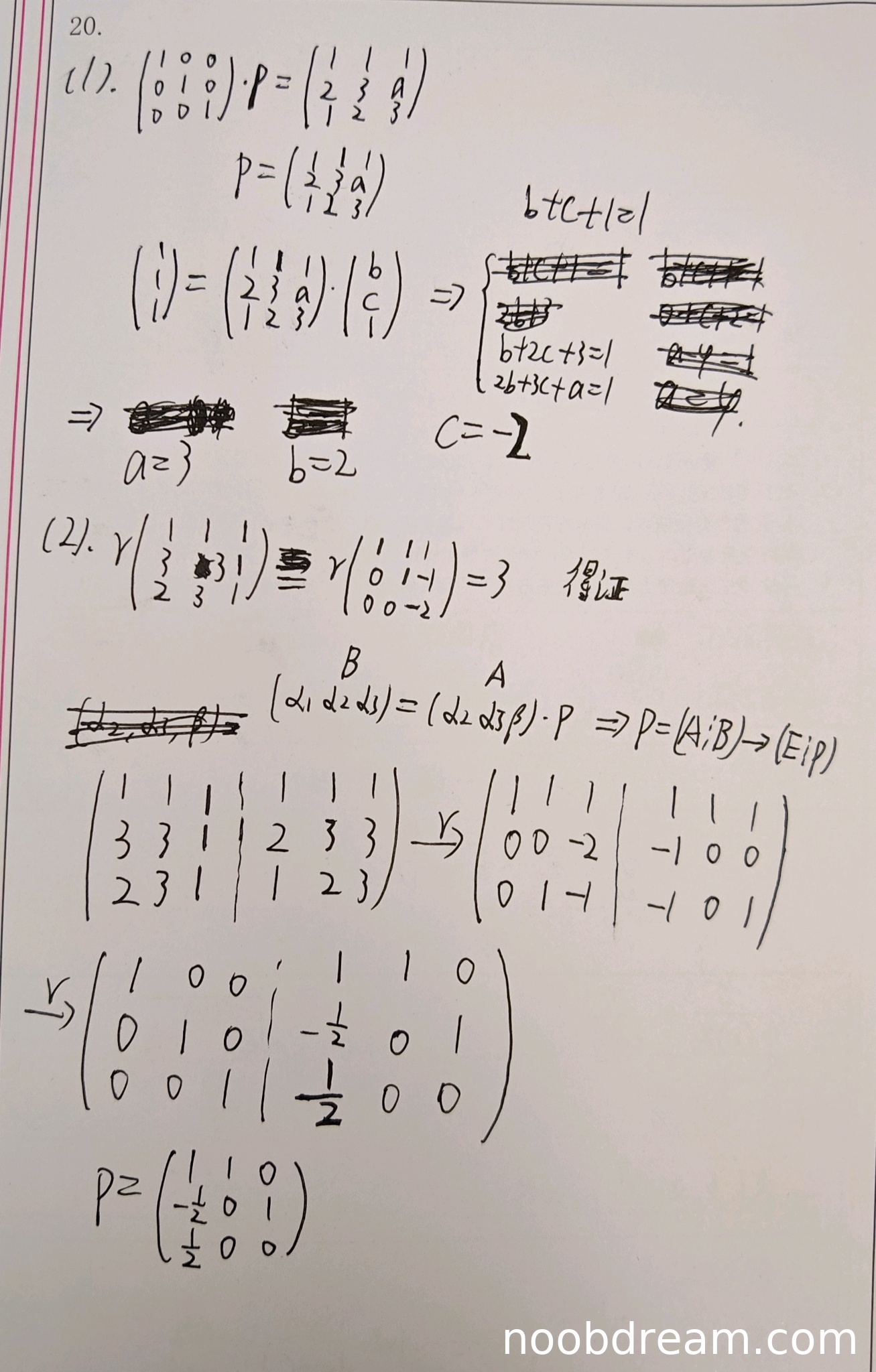 - 过渡矩阵部分:学生正确理解过渡矩阵定义,并通过初等行变换求解,但最终结果 \(P=\begin{pmatrix}1&1&0\\-\frac{1}{2}&0&1\\\frac{1}{2}&0&0\end{pmatrix}\) 与标准答案 \(\begin{pmatrix}1&1&0\\-\frac{1}{2}&0&1\\\frac{1}{2}&1&0\end{pmatrix}\) 第三行第二列元素不同(学生为0,标准为1)。计算错误导致结果不准确,扣1分,得2分。