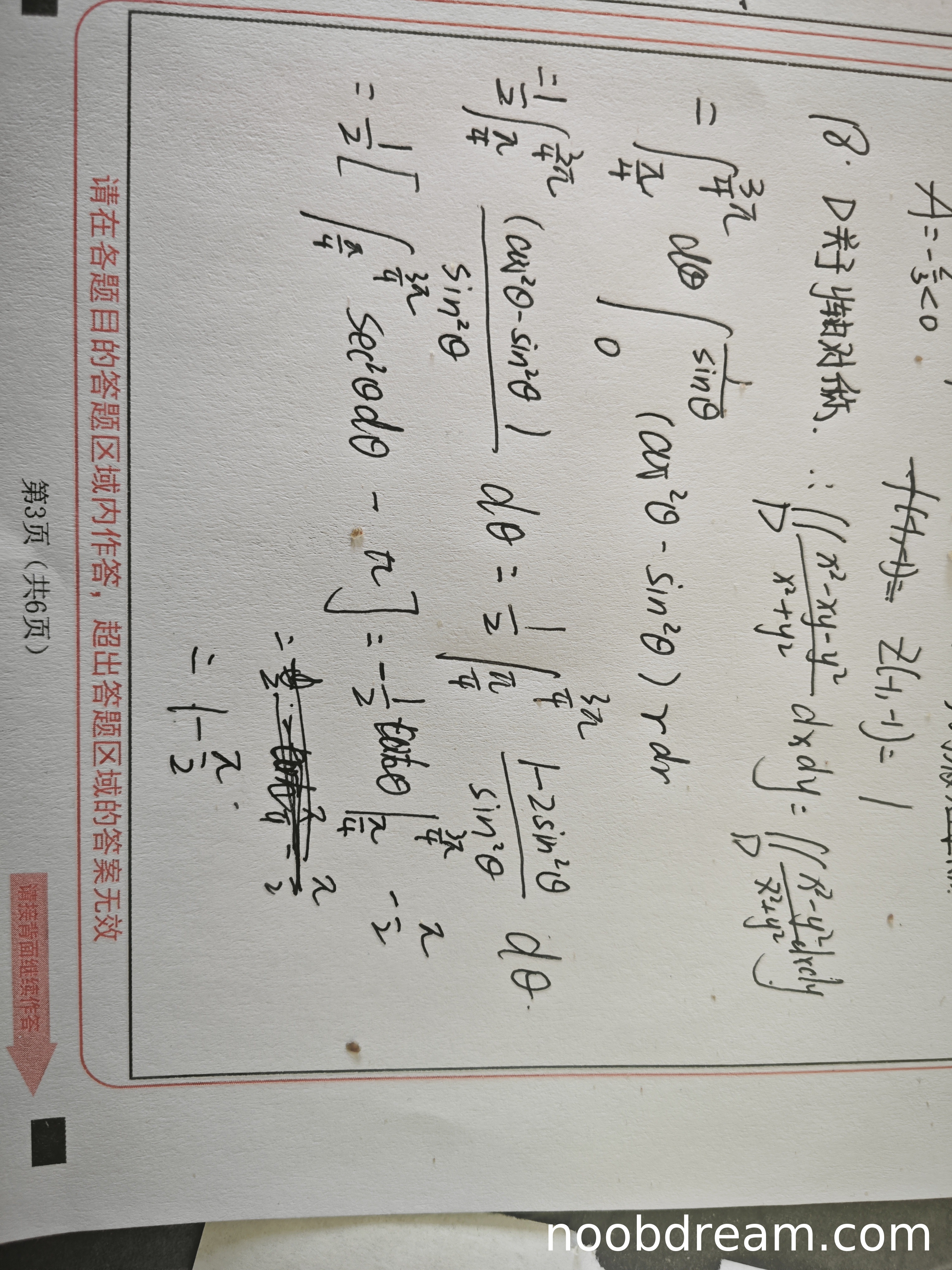 - 第二次识别结果:学生似乎想利用对称性,但被积函数识别错误(识别为x-xy²而非x²-xy-y²),且积分区域设定完全错误(设为整个单位圆盘)。这是根本性的逻辑错误,扣5分。