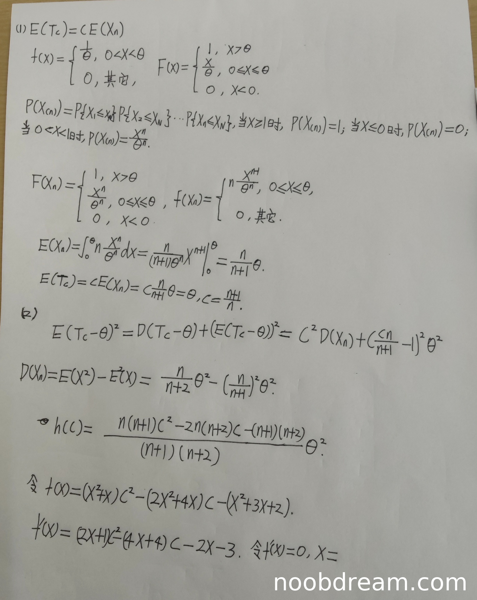 学生作答中,第1次识别结果和第2次识别结果均尝试使用$h(c) = E(T_c - \theta)^2 = D(T_c) + [E(T_c) - \theta]^2$的公式,并正确指出$D(T_c) = c^2 D(X_{(n)})$。计算$D(X_{(n)})$时,正确给出$E(X_{(n)}^2) = \frac{n}{n+2}\theta^2$和$E(X_{(n)}) = \frac{n}{n+1}\theta$。但在第1次识别中,$h(C)$的表达式复杂且未化简,且后续引入$f(x)$和求导过程混乱(变量$x$与$n$混淆,且未完成求解)。第2次识别中同样未完成最小化过程。学生未能正确导出$h(c)$的简洁表达式并求导得最优$c$,但思路部分正确(使用了方差公式)。由于未得到正确结果$c = \frac{n+2}{n+1}$,且推导不完整,扣3分。