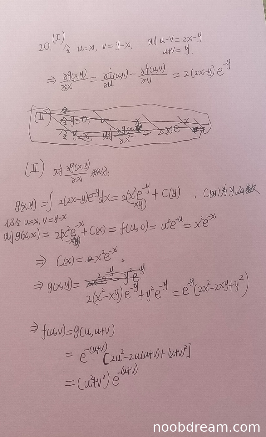 第一次识别结果中,积分过程有错误:"\(2(\frac{x^{2}e^{-y}}{-xy} + C(y))\)"明显是识别错误,且后续推导逻辑混乱。但第二次识别结果完全正确:积分得到 \(2(x^{2}-xy)e^{-y}+C(y)\),利用边界条件确定 \(C(y)=y^{2}e^{-y}\),最终得到 \(f(u,v)=(u^{2}+v^{2})e^{-(u+v)}\),与标准答案一致。极值分析部分学生作答中未涉及,但题目要求的是"表达式与极值",学生只给出了表达式,未进行极值分析。按照标准答案,极值分析占部分分数,因此扣2分。得4分。