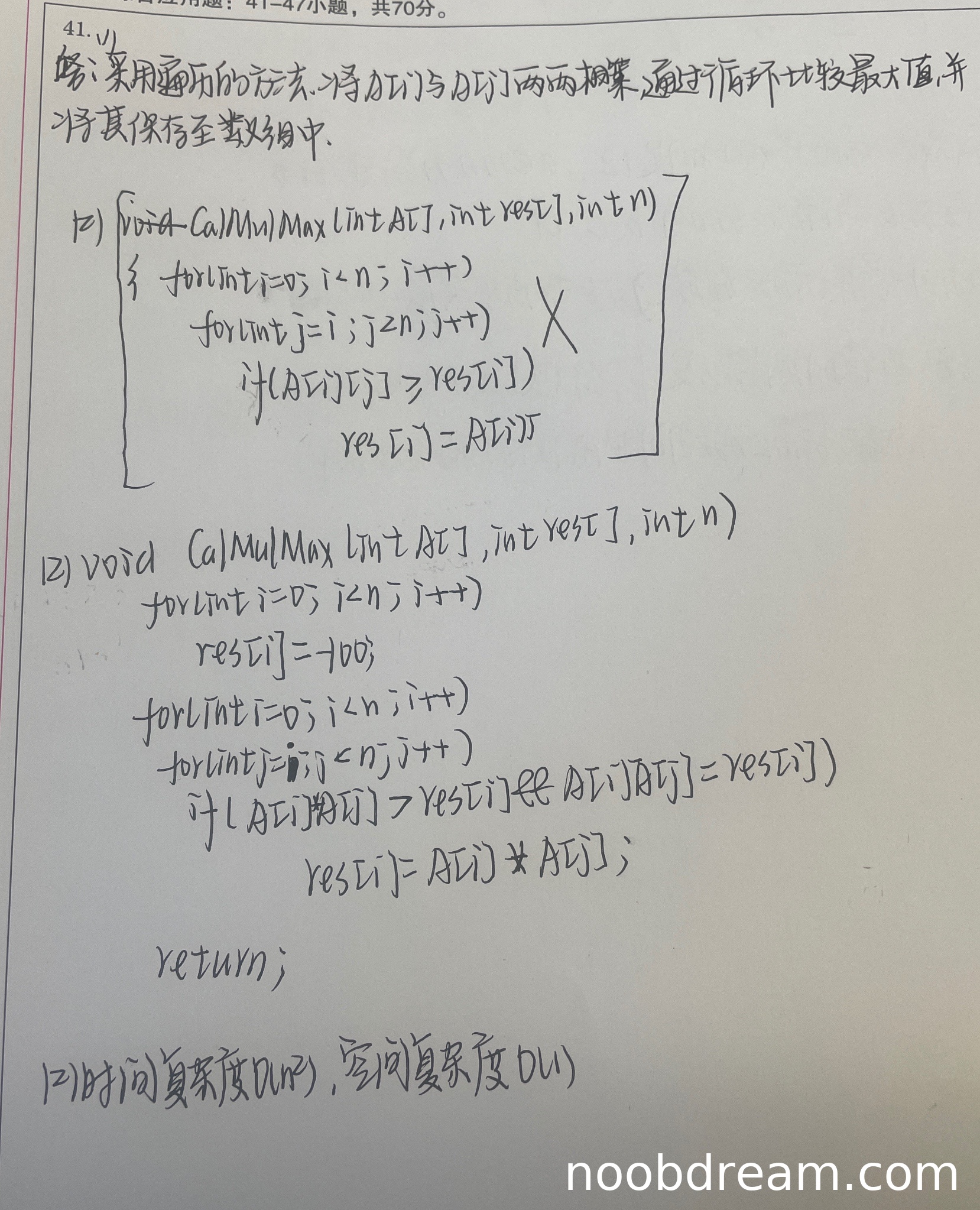 学生给出的基本设计思想是采用双重循环遍历的方法,将A[i]与A[j]两两相乘并比较最大值。这种方法虽然正确,但时间复杂度为O(n²),不是题目要求的"时间和空间上尽可能高效的算法"。标准答案采用O(n)时间复杂度的算法,从右向左遍历一次即可完成。由于学生的算法思想正确但效率不高,扣2分。