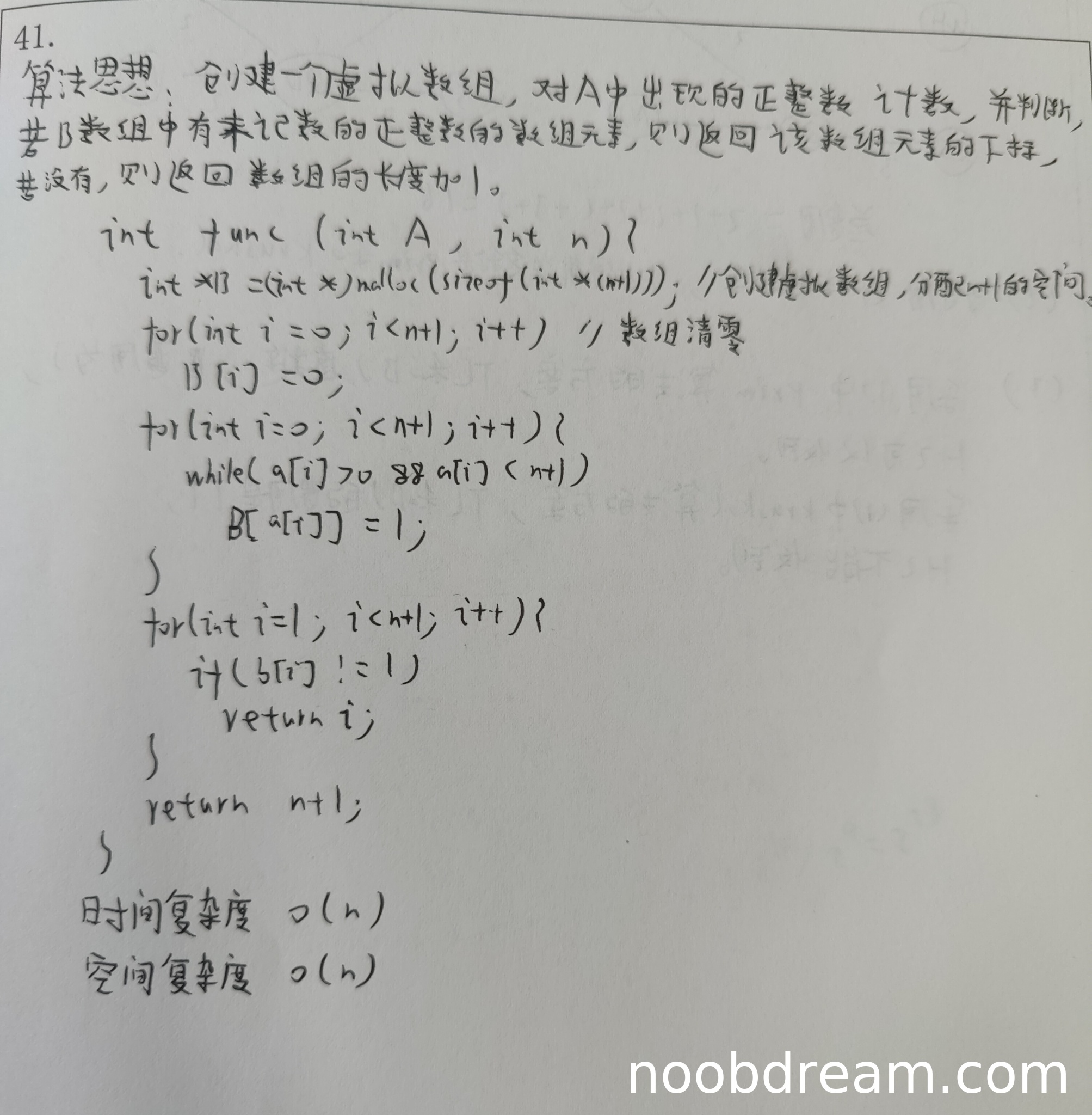 理由:学生的基本设计思想是创建一个辅助数组来标记出现的正整数,思路正确。但描述中"对A中出现的正整数计数"不够准确,实际是标记出现与否而非计数,且未说明如何处理非正整数的情况。相比标准答案中利用原数组进行标记的方法,该思路需要额外空间,但算法思想基本正确。