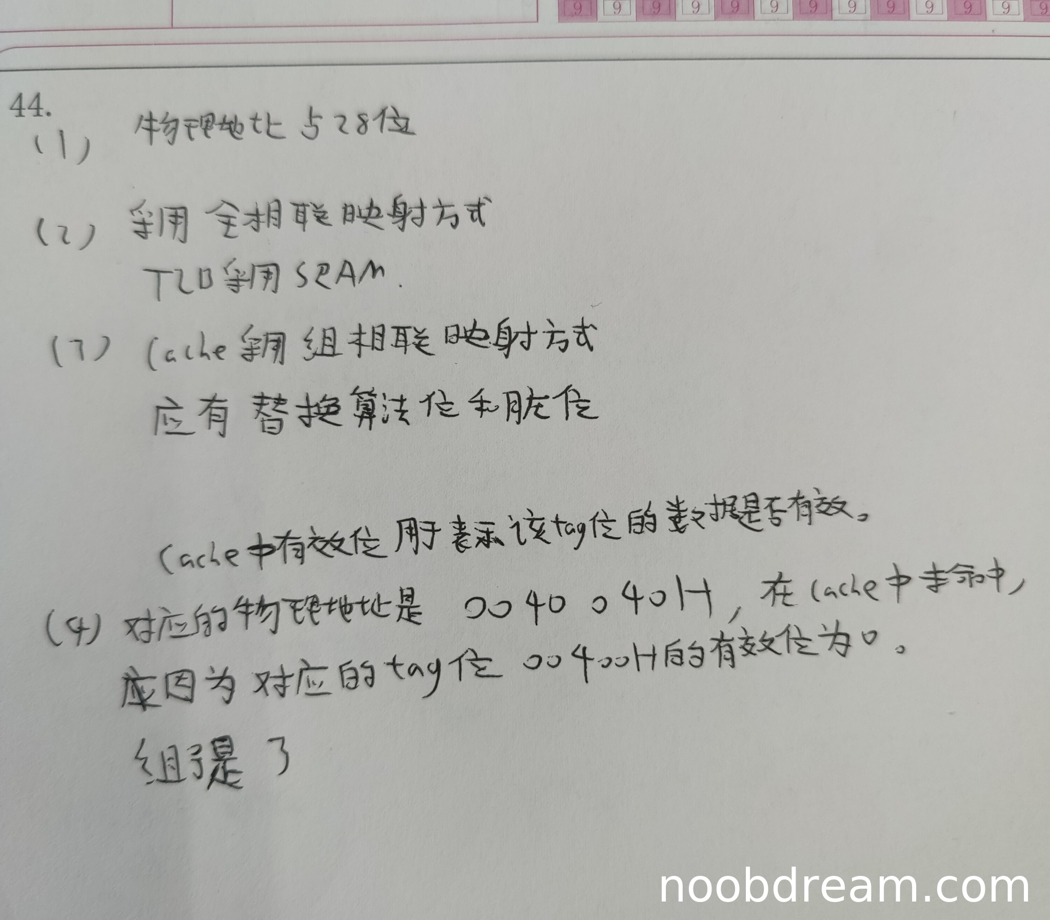 第一问:两次识别结果都正确回答了物理地址为0040040H。第二问:正确判断了未命中,理由基本正确(第一次识别说tag位是004000H,第二次说0040H,存在轻微差异但不影响核心逻辑)。第三问:正确回答了组号为3。因此得5分。