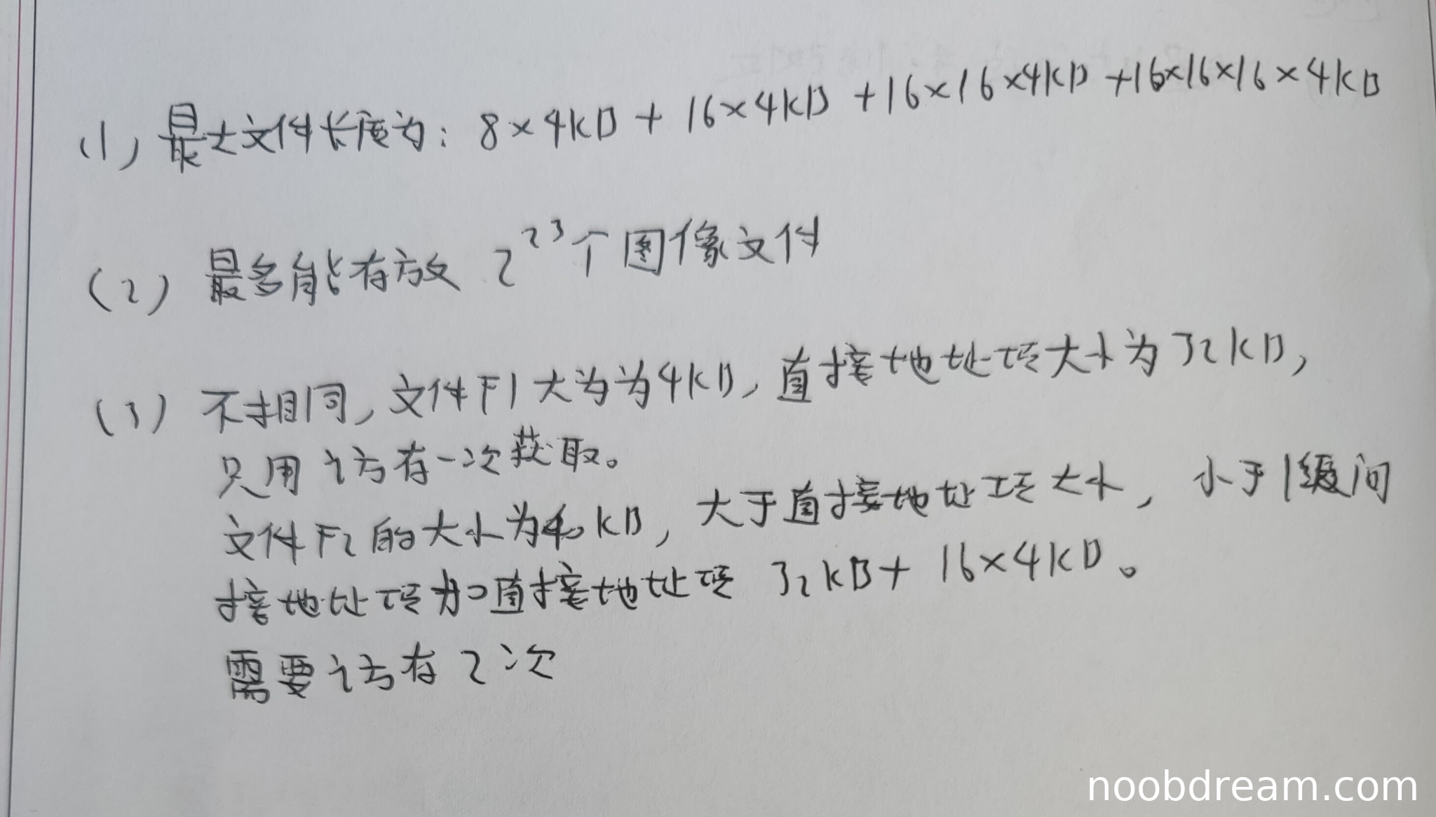 学生答案中给出最多能存放2²³个图像文件(即8,388,608个)。标准答案应为64M个(即67,108,864个)。
