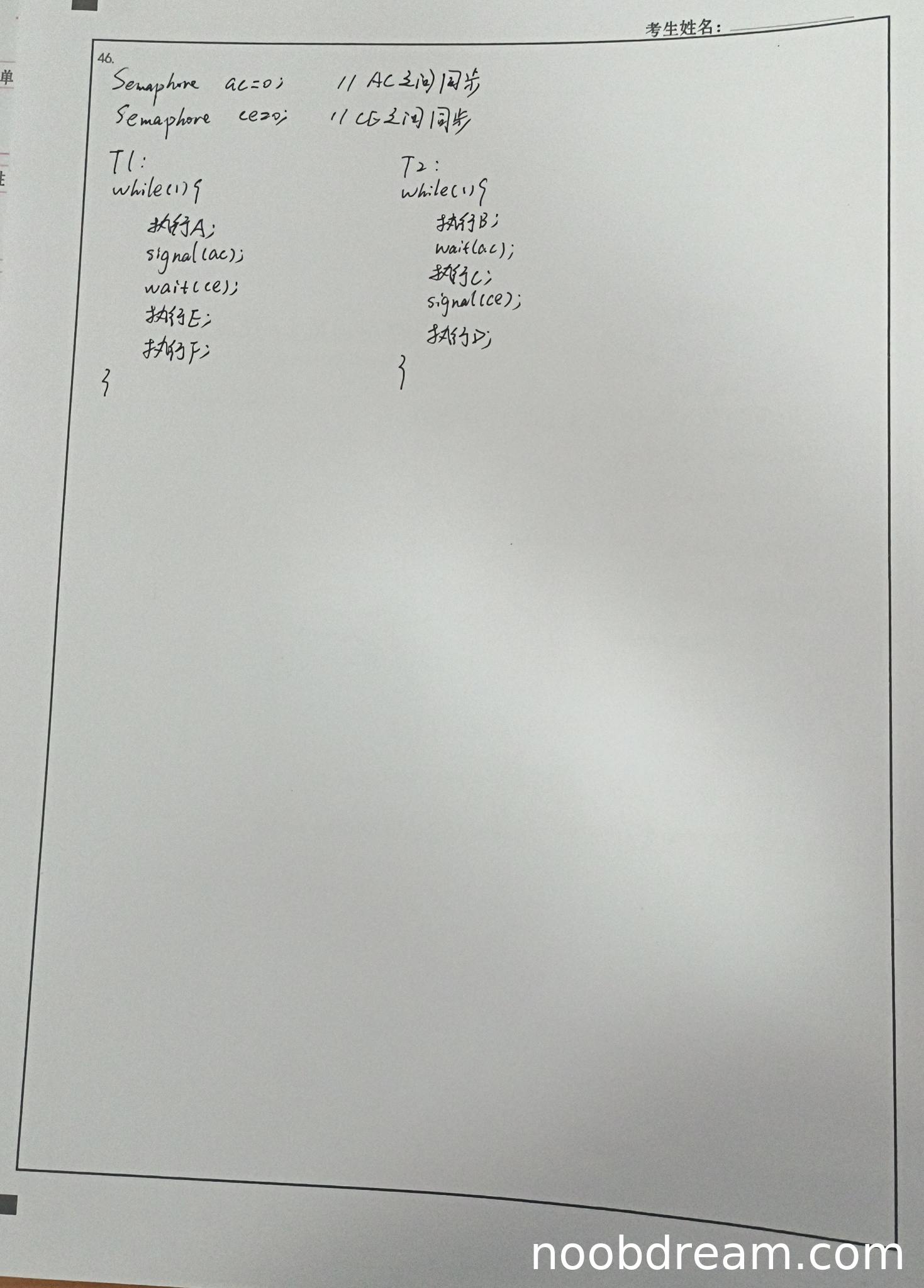 (3)线程T2的同步操作(满分3分)