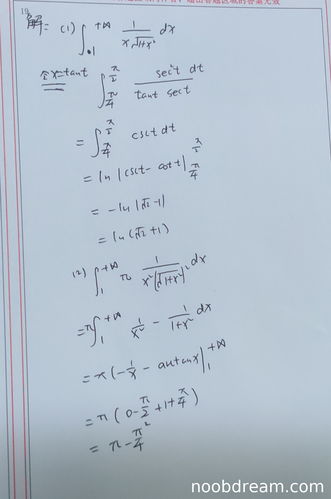 第1次识别结果中,学生使用三角代换法计算面积积分,思路正确,计算过程完整,最终结果与标准答案一致(虽然中间步骤中写的是csc t - cot t,但代入上下限后得到-ln|√2 - 1|,化简后等于ln(√2 + 1),与标准答案等价)。第2次识别结果中,虽然积分下限误写为0.1,但实际计算时仍使用π/4,最终结果正确。因此本题得满分6分。