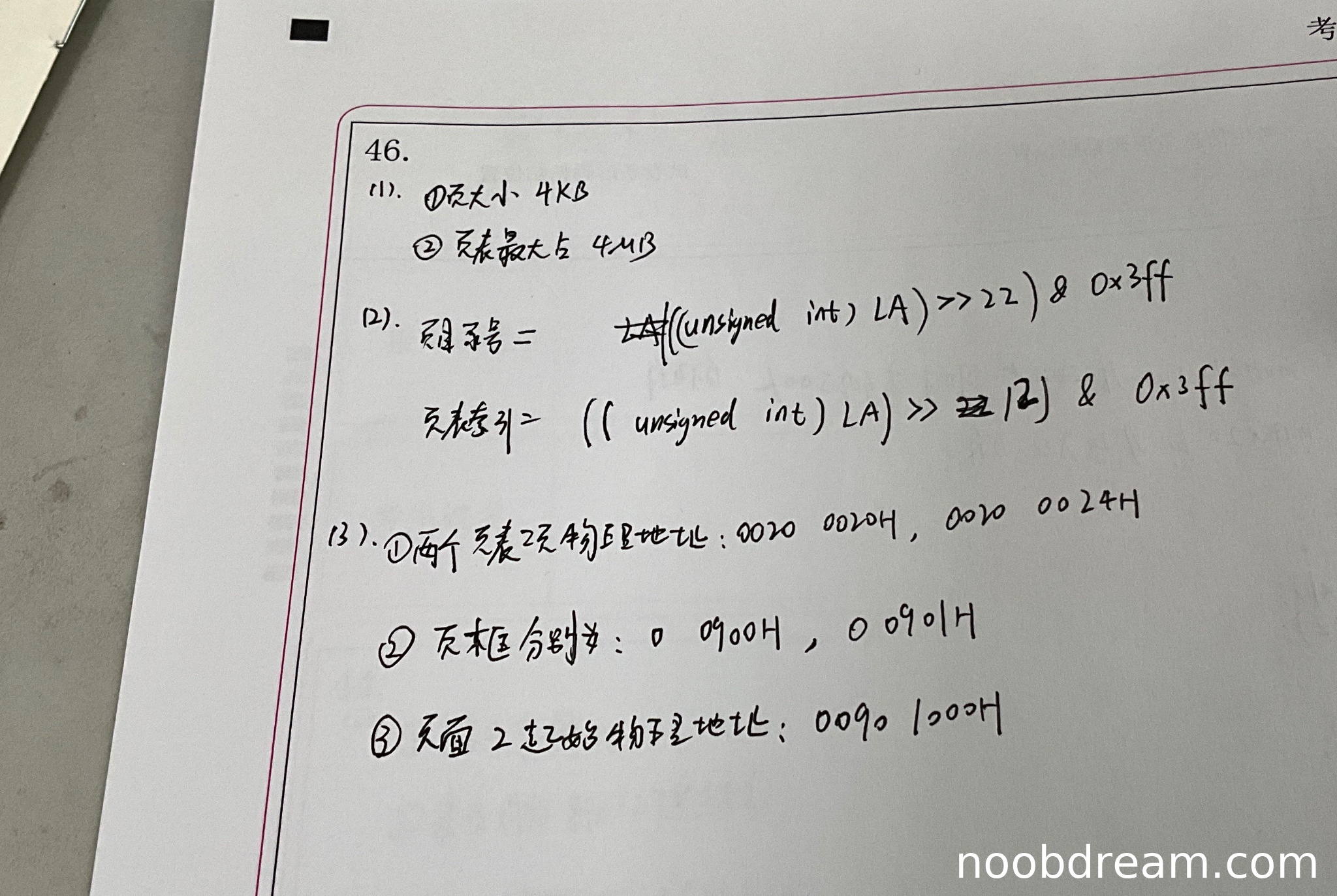 学生答案:页号 = ((unsigned int) LA) >> 22) & 0x3ff,页索引 = ((unsigned int) LA) >> 12) & 0x3ff。其中"页号"对应标准答案的"页目录号","页索引"对应标准答案的"页表索引",表达式正确。得2分。