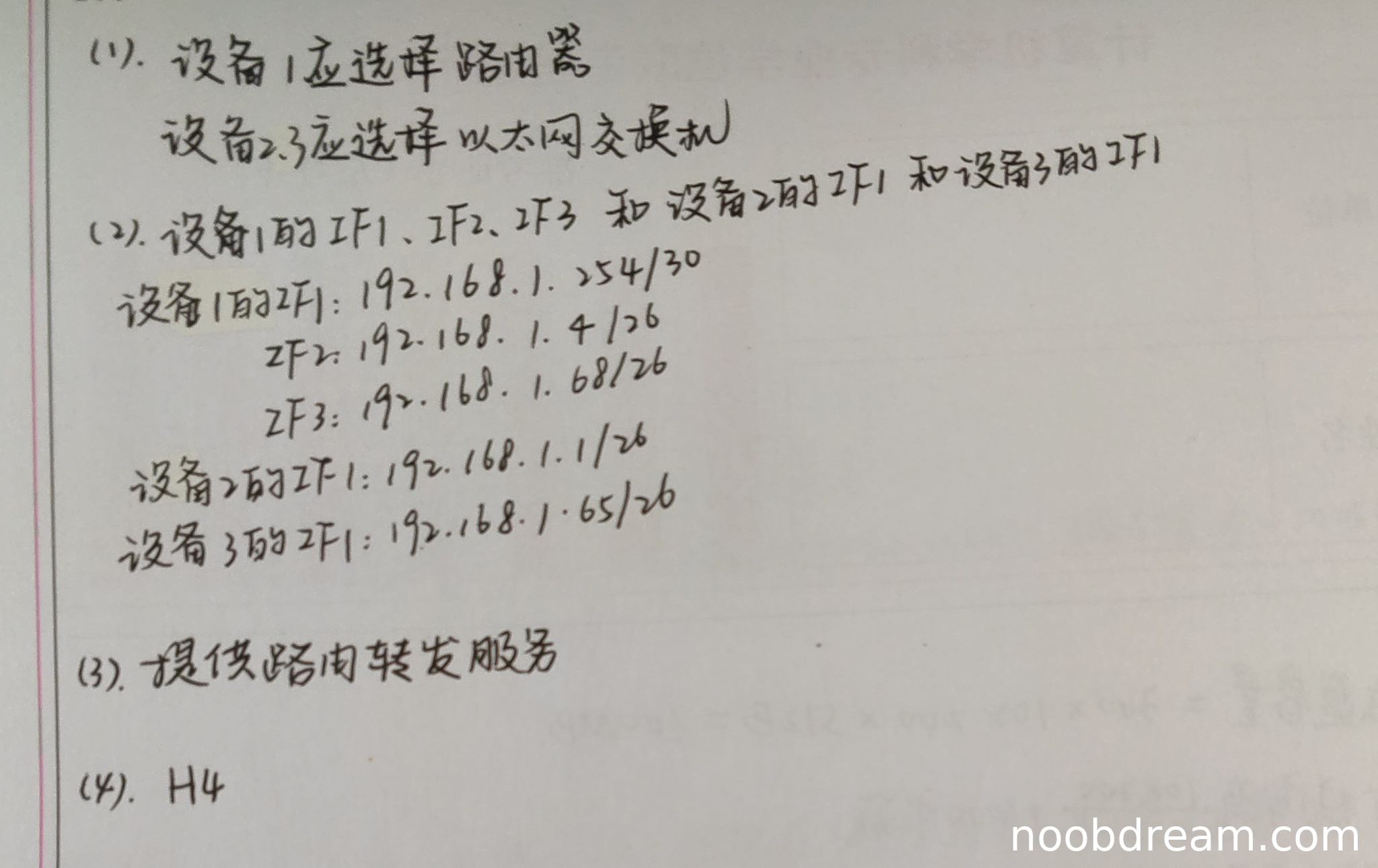 学生答案指出设备1的IF1、IF2、IF3需要配置IP地址,这是正确的。但错误地认为设备2和设备3的IF1也需要配置IP地址(实际上交换机无需配置IP地址)。在IP地址配置方面,学生给出的设备1的IF1地址192.168.1.254正确,但IF2地址192.168.1.4/26和IF3地址192.168.1.68/26均错误(标准答案为192.168.1.1和192.168.1.65)。由于存在两处关键错误(多余设备配置和错误IP地址),扣2分。得2分。