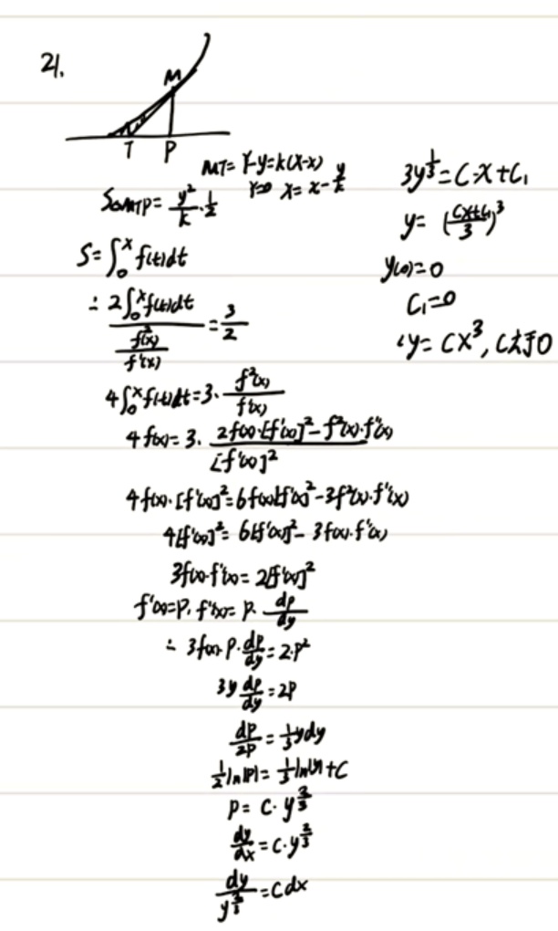 学生作答中包含了两种不同的解题思路。第一种思路(第1次识别结果)在建立面积比例关系时出现了错误:将面积比表达式写为 \(\frac{2\int_{0}^{x}f(t)dt}{\frac{f(x)}{f(0)}} = \frac{3}{2}\) 是不正确的,这导致后续推导出现根本性错误。虽然最终得到了正确结果 \(y = Cx^3\),但这是通过错误的推导过程偶然得到的,因此不能给予分数。