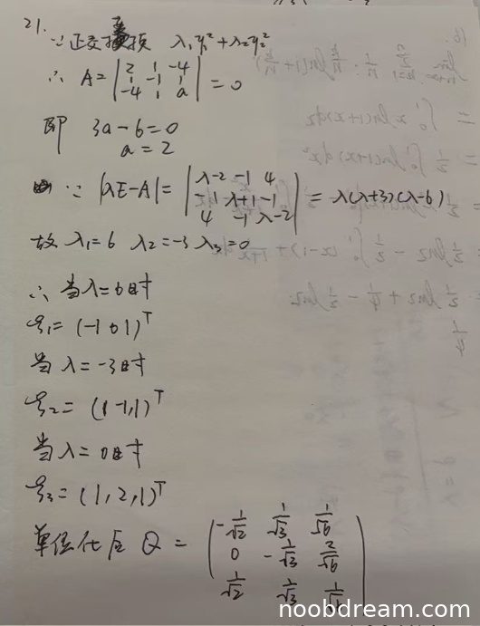 学生两次识别都给出了正确的特征向量:ξ₁=(-1,0,1)ᵀ,ξ₂=(1,-1,1)ᵀ,ξ₃=(1,2,1)ᵀ,与标准答案一致。单位化结果也正确,正交矩阵Q的构造正确。虽然在第一次识别中Q的列向量顺序与标准答案不同(但这是允许的),第二次识别中Q的列向量顺序与标准答案一致。考虑到正交矩阵的列向量顺序可以调整,不扣分。得6分。