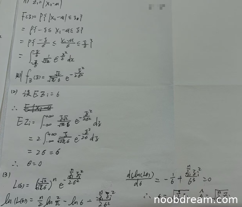 第1次识别结果中,似然函数形式有误(分母含6),求导后结果错误。第2次识别结果正确写出似然函数 \( L(\sigma) = \left( \frac{\sqrt{2}}{\sigma\sqrt{\pi}} \right)^n e^{-\frac{\sum Z_i^2}{2\sigma^2}} \),取对数并求导,得到方程 \( -\frac{n}{\sigma} + \frac{\sum Z_i^2}{\sigma^3} = 0 \),解得 \( \hat{\sigma} = \sqrt{\frac{1}{n}\sum Z_i^2} \),与标准答案一致。思路和结果正确。得4分。