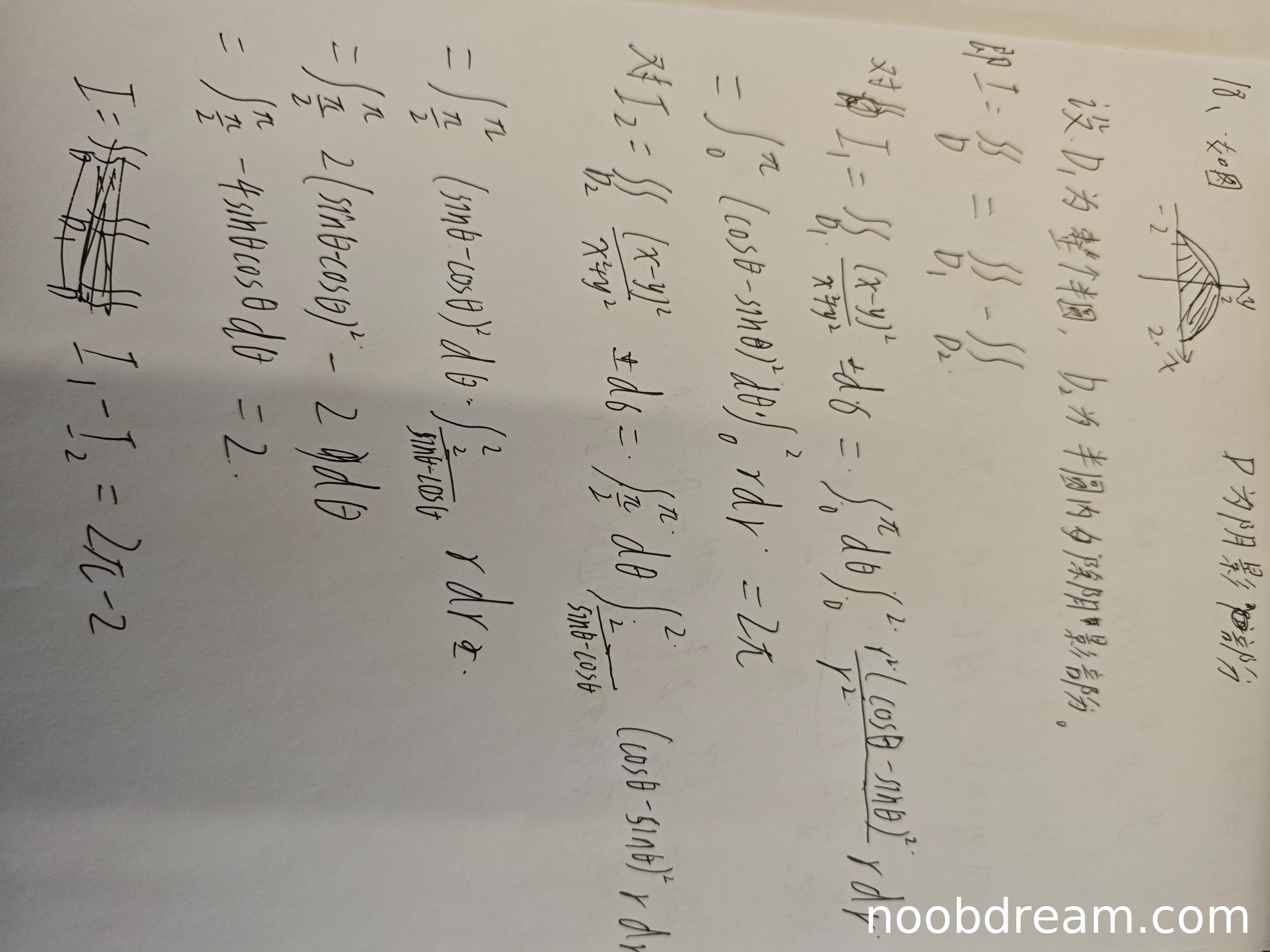 - 但对D₂的区域定义和积分限设置错误(θ范围应为π/2到π,r范围应为0到2/(sinθ-cosθ))