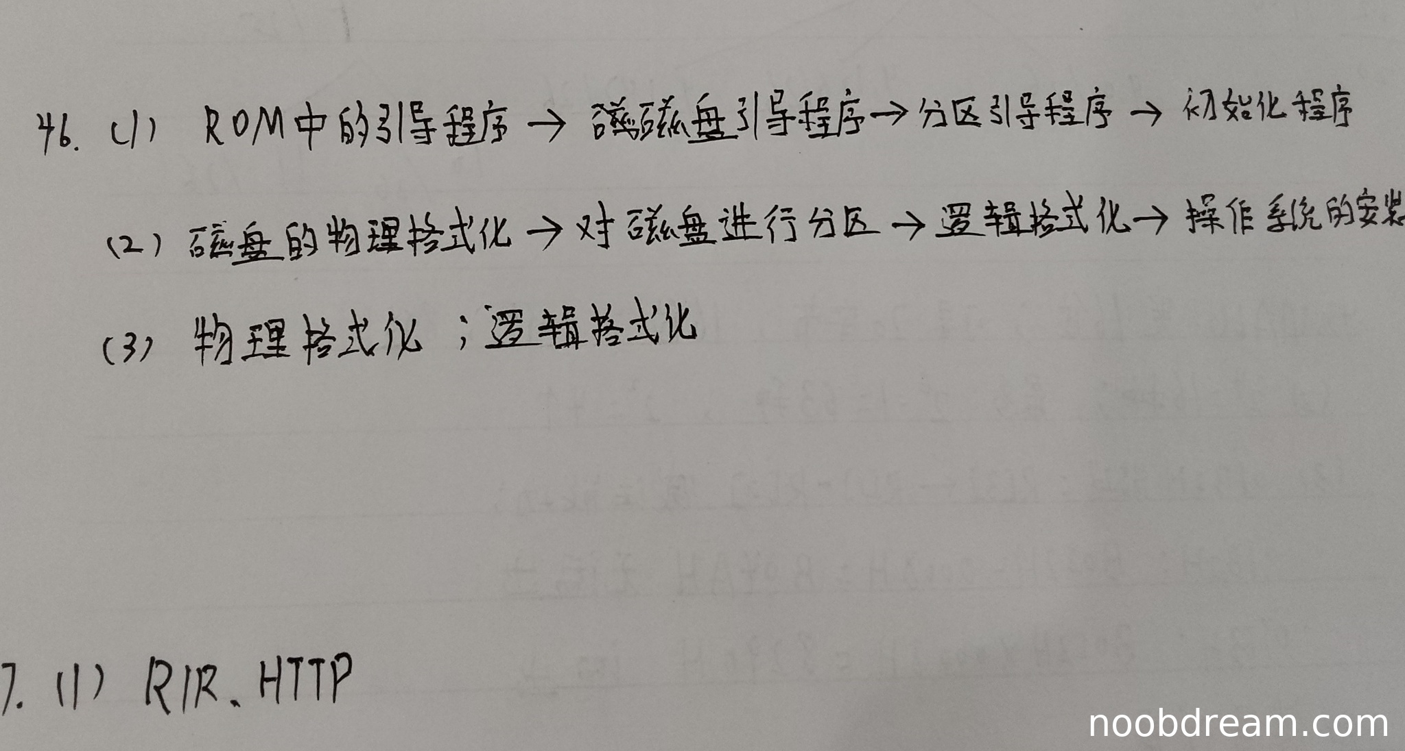学生答案:磁盘的物理格式化→对磁盘进行分区→逻辑格式化→操作系统的安装