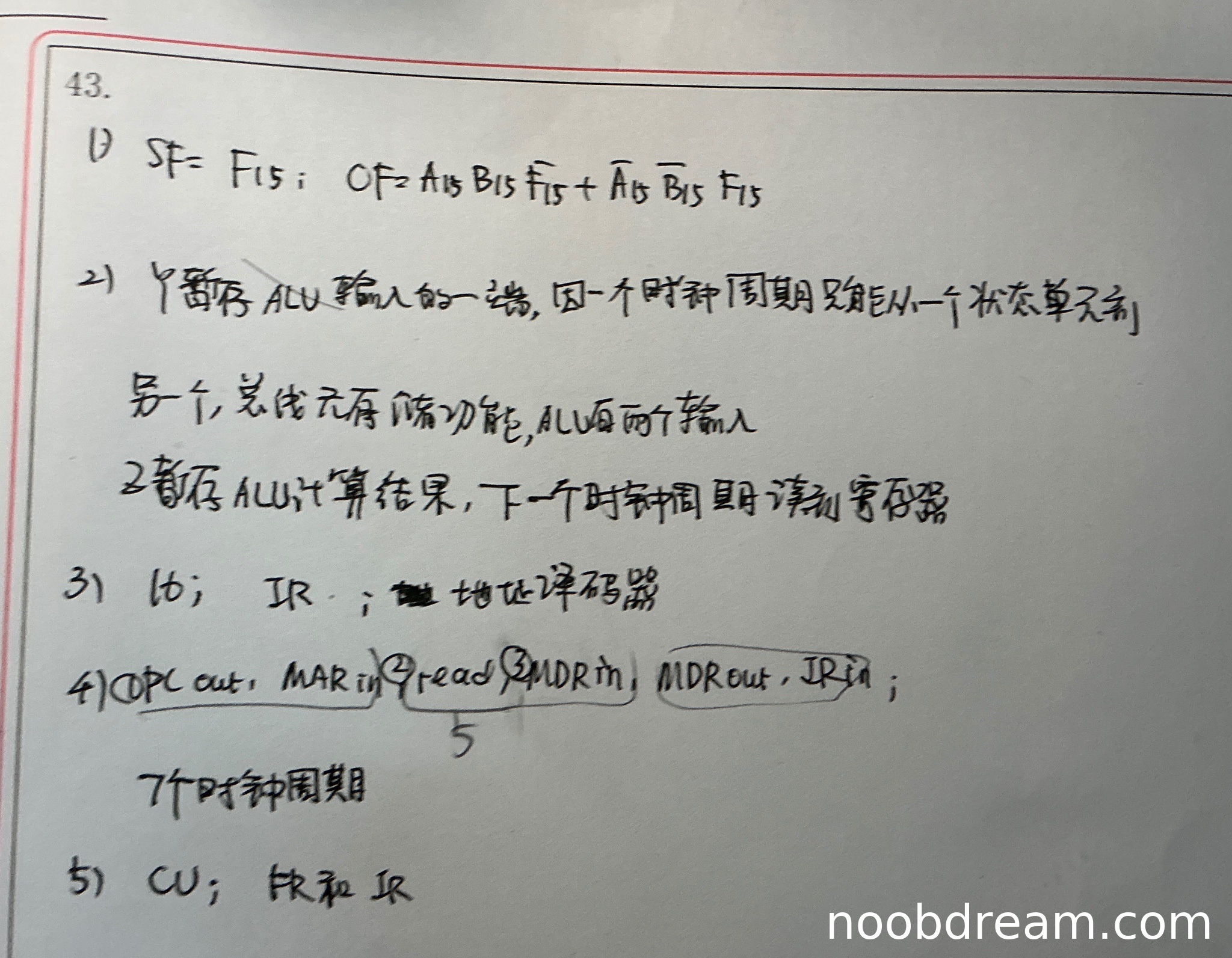 第二问:学生回答CF = A15 B15 F15̅ + A15̅ B15 F15(第一次识别)或CF = A15 B15 F15 + A15 B15 F15(第二次识别)。标准答案要求分别给出A加B和A减B的OF逻辑表达式,但学生只给出一个表达式且标记为CF(可能是OF的误写)。第一次识别的表达式与标准答案中A加B的OF逻辑表达式一致,但未区分加法和减法;第二次识别的表达式逻辑错误(缺少取反操作)。由于学生未完整回答两个表达式,且部分表达式有误,扣1.5分。得1.5分。