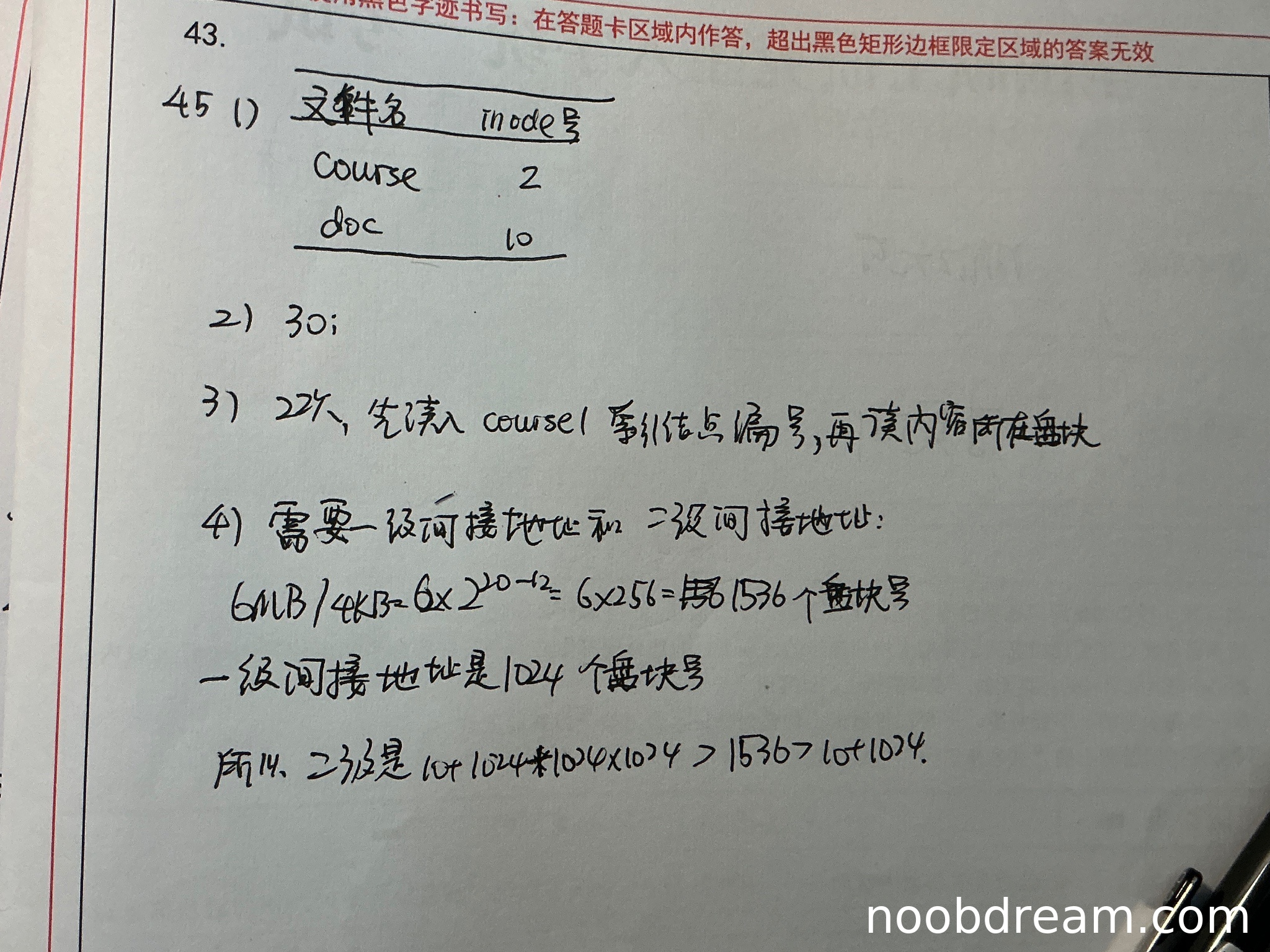 学生正确指出需要一级和二级间接地址项,计算过程基本正确:6MB/4KB=1536个盘块号,一级间接地址支持1024个盘块号,并正确判断1536>1024。虽然计算表达式中有一些识别错误(如2²⁰÷2¹²),但核心逻辑正确。因此得2分。