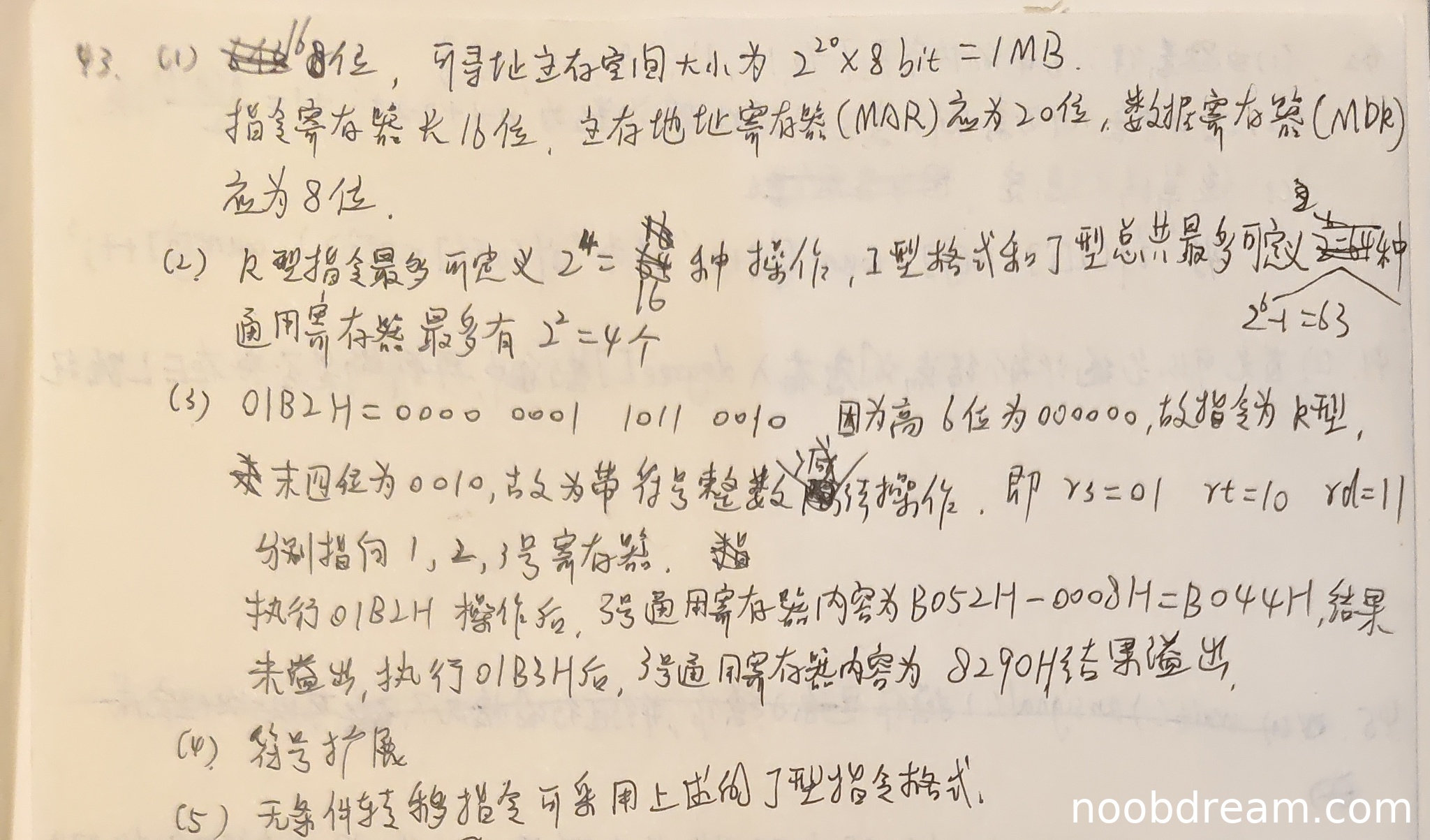学生第一次识别回答:R型最多16种操作正确(1分),I型和J型总共63种正确(1分),通用寄存器最多4个正确(1分)。第二次识别回答中I型和J型总共64种错误,但第一次识别正确,且可能为识别错误,不扣分。因此本小题得3分。