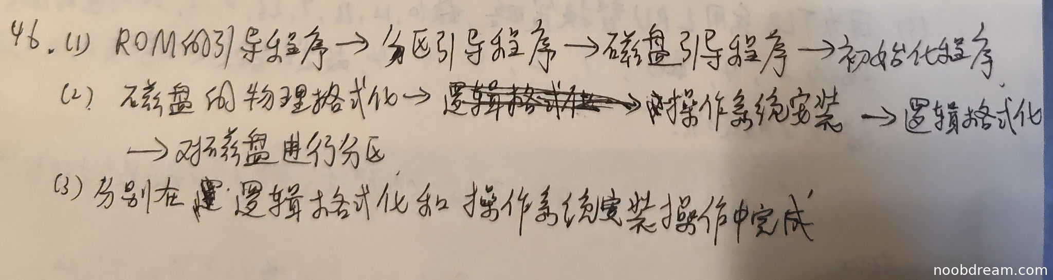 第一次识别结果顺序为:磁盘的物理格式化→对磁盘进行分区→逻辑格式化→操作系统安装→逻辑格式化;第二次识别结果顺序为:磁盘的物理格式化→逻辑格式化→操作系统安装→逻辑格式化→对磁盘进行分区。两次识别结果都存在逻辑错误:第一次识别中"逻辑格式化"重复出现且位置不当;第二次识别中"逻辑格式化"出现在"对磁盘进行分区"之前,这是明显的逻辑错误。标准答案顺序应为:磁盘的物理格式化→对磁盘进行分区→逻辑格式化→操作系统的安装。由于存在严重逻辑错误,扣3分。得0分。