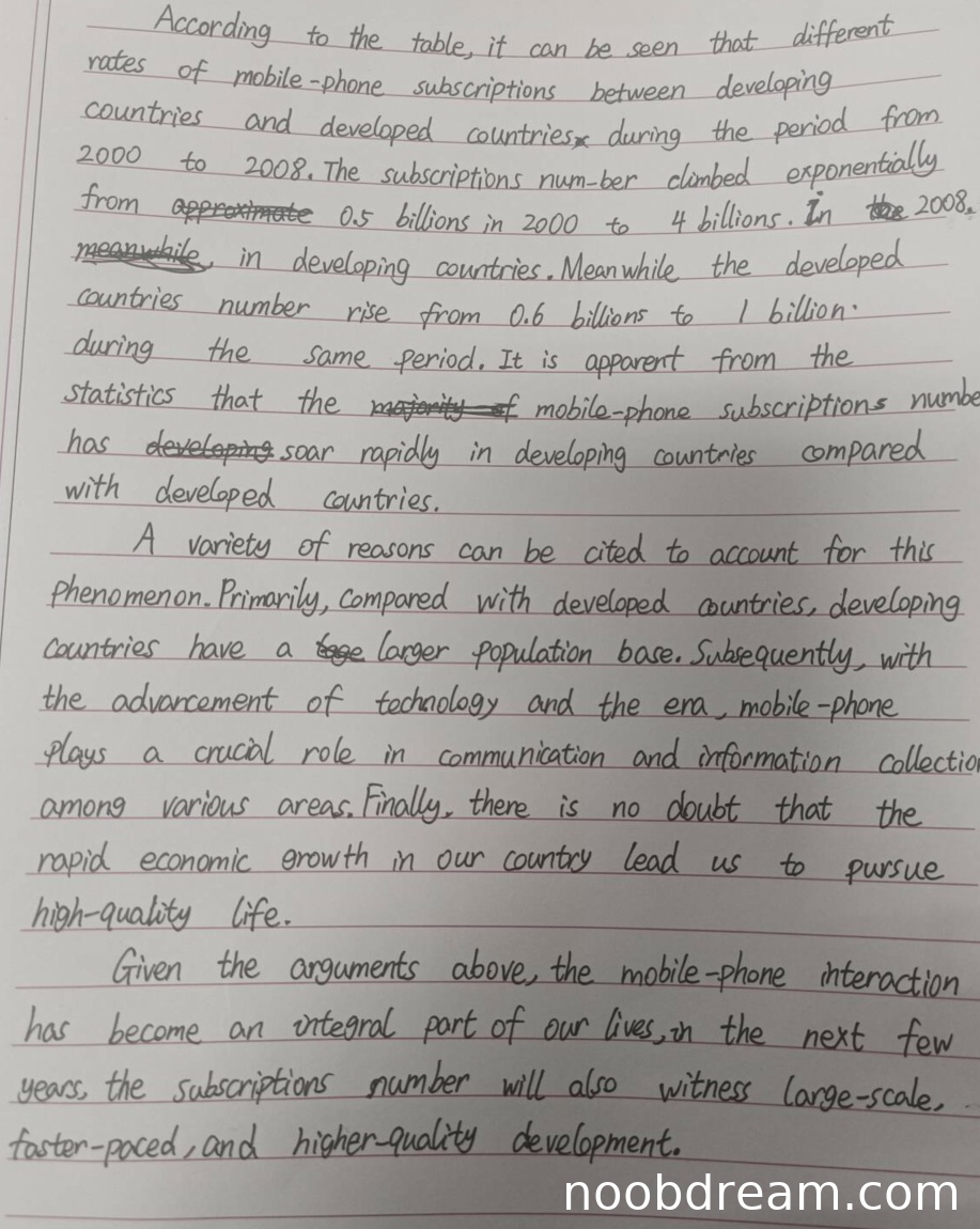 该作文完全偏离了题目要求。题目要求基于公司员工工作满意度调查表格进行写作,但学生作文讨论的是发展中国家与发达国家的手机订阅量对比。作文未能描述题目给出的表格内容,也没有对员工满意度进行任何评论。根据评分标准第四档(5-8分)中"漏掉或未能有效阐述一些内容要点"的标准,此处应严重扣分。