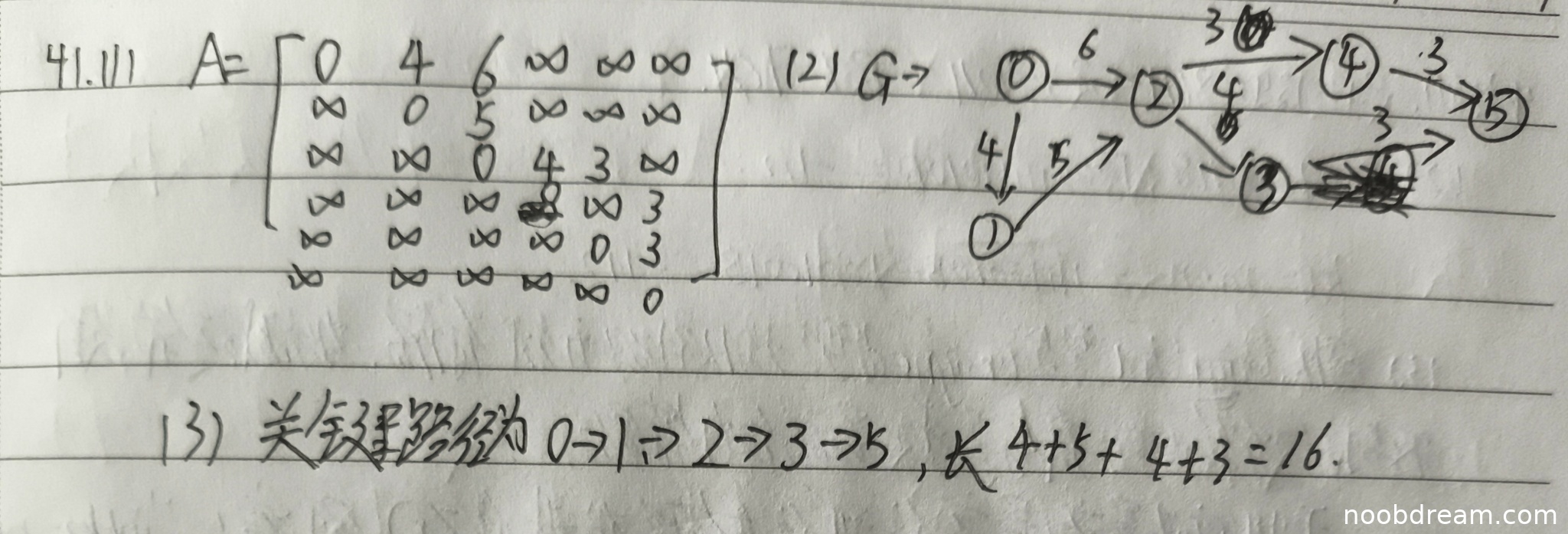 学生正确找到了关键路径0→1→2→3→5,并准确计算了路径长度4+5+4+3=16,与标准答案完全一致。因此得4分。