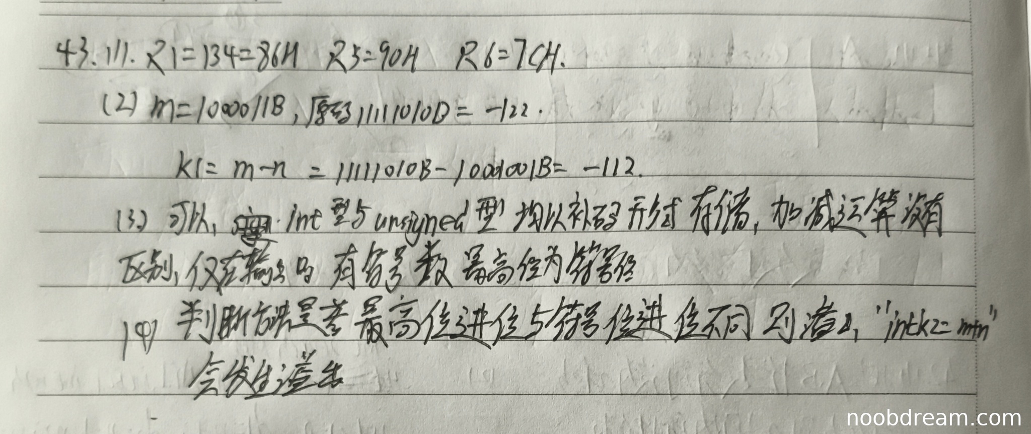 学生正确给出了溢出判断方法(最高位进位与符号位进位不同),但错误指出溢出语句为“int k2=m-n”,应为“int k2=m+n”。由于学生正确判断了溢出条件,但具体语句错误,扣1分。得2分。