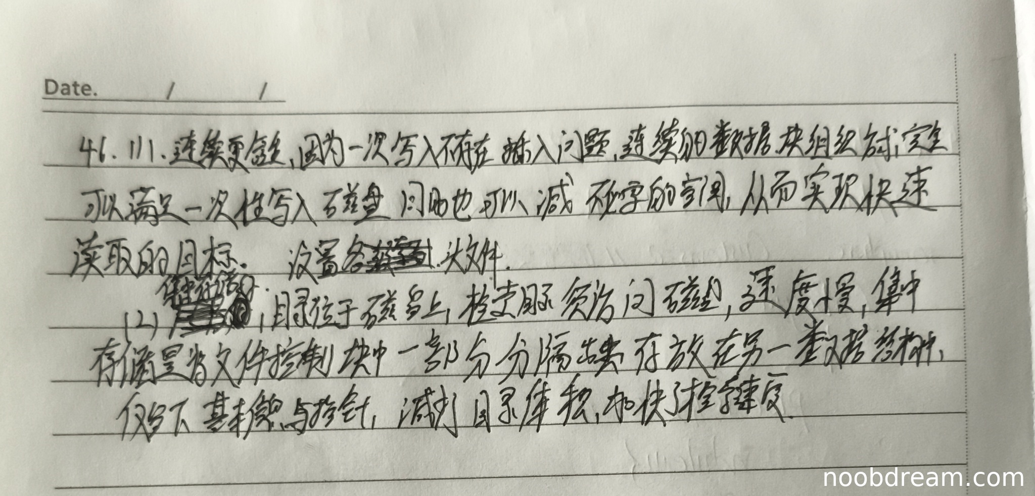 学生回答中选择了"连续更合适",理由包括"一次写入不存在插入问题"(应为扩展问题,但意思接近)、"连续的数据块组织方式可以满足一次性写入磁盘"、"减少碎片的空间"(应为减少空间开销或碎片)、"实现快速读取的目标"。这些理由与标准答案基本一致,核心逻辑正确。对于FCB中需要设计的字段,学生回答"设置合簇的头文件"(可能为"设置合适的头文件"的识别错误)或未明确说明,但标准答案要求的是起始块号和块数等具体字段,这里没有给出明确答案。因此,第一问的理由部分正确,但FCB字段描述缺失或错误。扣分:理由部分基本正确,但不够完整(未提及寻道时间最短),扣0.5分;FCB字段描述错误或缺失,扣2分。得分:4 - 0.5 - 2 = 1.5分。