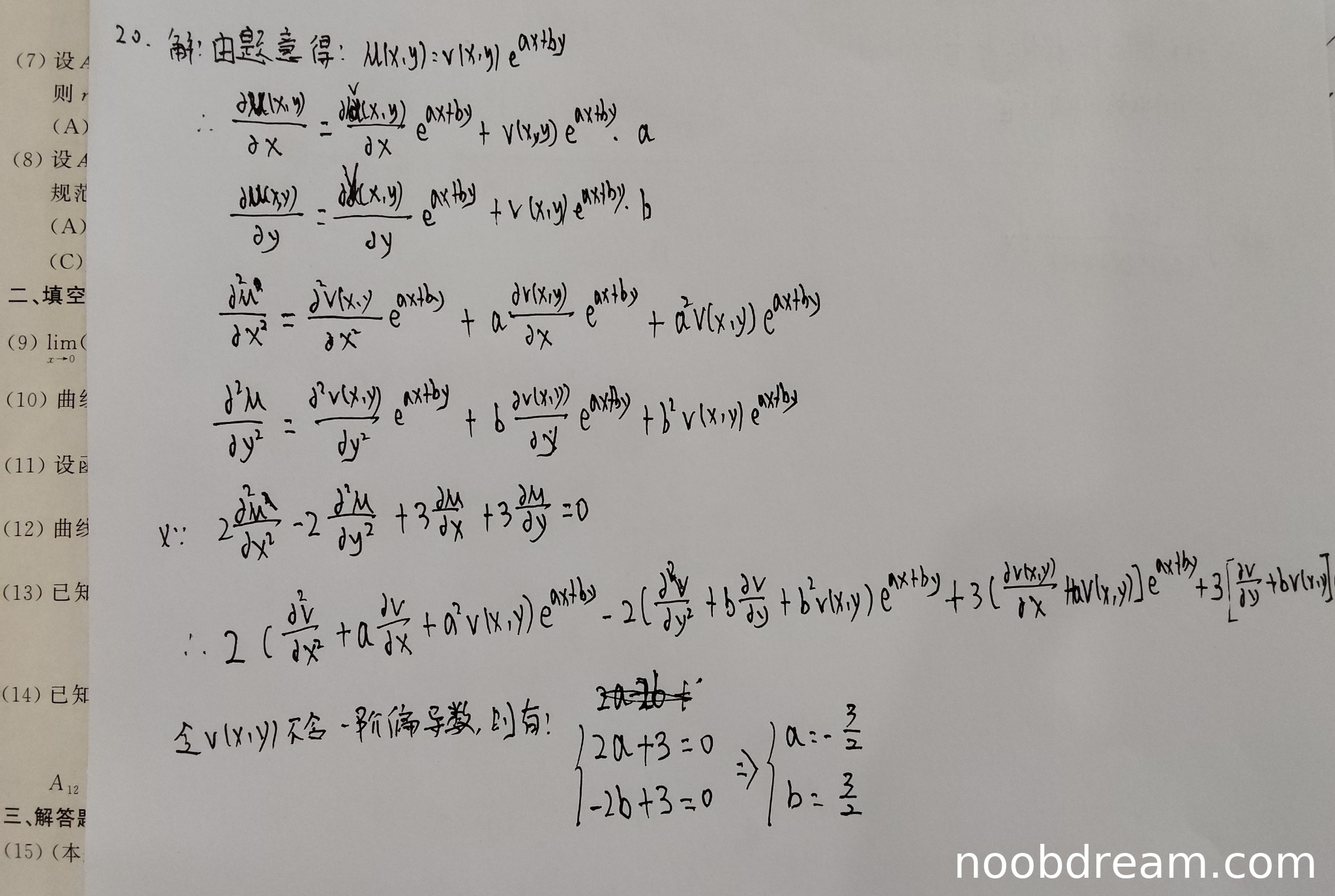 - 然而,标准答案中 \(b=\frac{3}{4}\),说明学生的方程组建立有误。正确的系数应为:从原方程变换后,\(\frac{\partial v}{\partial y}\) 的系数是 \(-2b + 3\),但学生忽略了系数前的符号问题,实际上应为 \(2(-b) + 3 = -2b + 3\),学生计算正确,但标准答案为 \(b=\frac{3}{4}\),表明学生的理解有偏差。