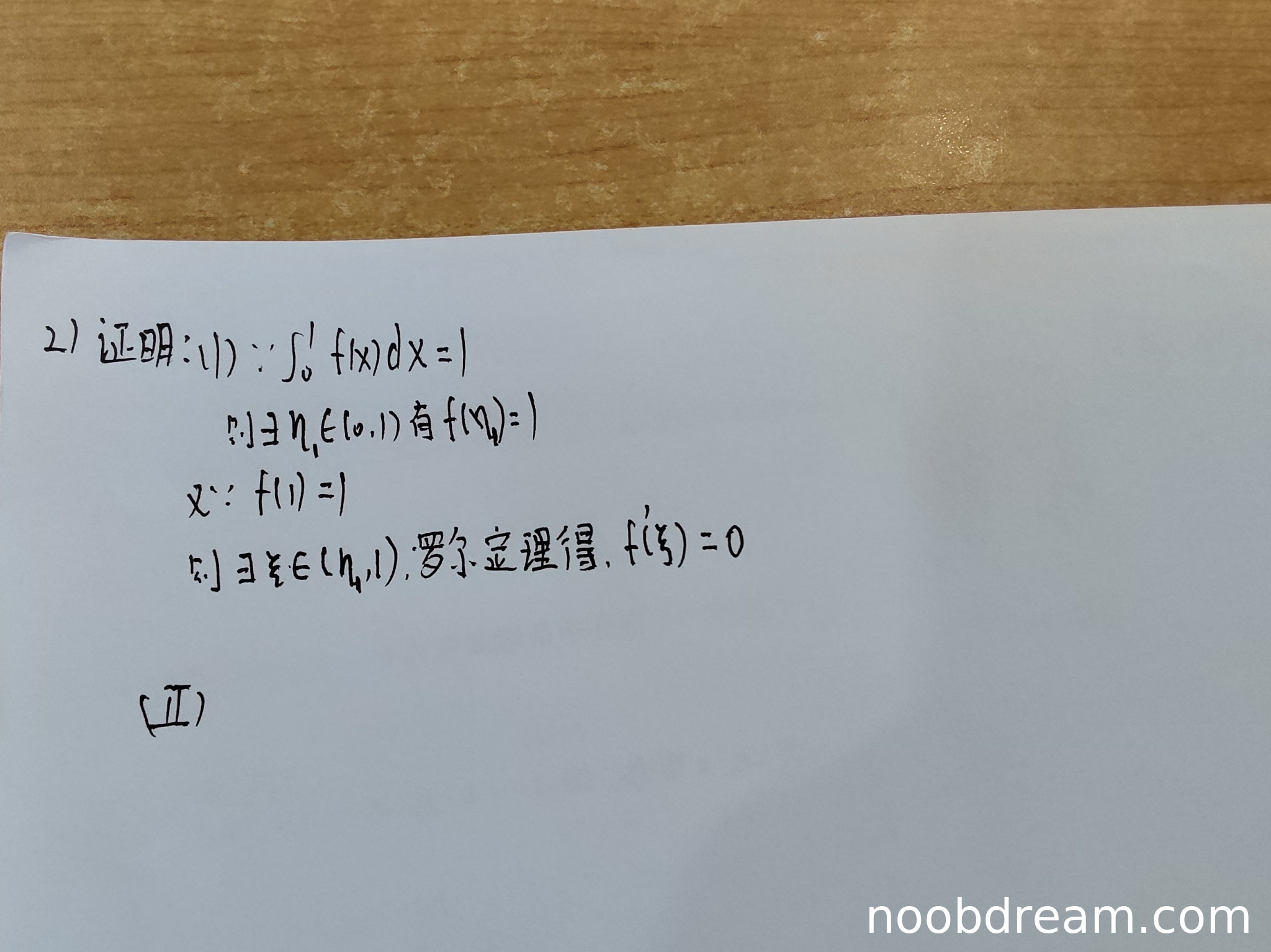 学生试图通过积分中值定理和罗尔定理来证明第一问。思路基本正确:由∫₀¹f(x)dx=1和f(1)=1,应用积分中值定理得到存在η₁∈(0,1)使f(η₁)=1,再结合f(1)=1,在[η₁,1]上应用罗尔定理得到存在ξ∈(η₁,1)⊂(0,1)使f'(ξ)=0。