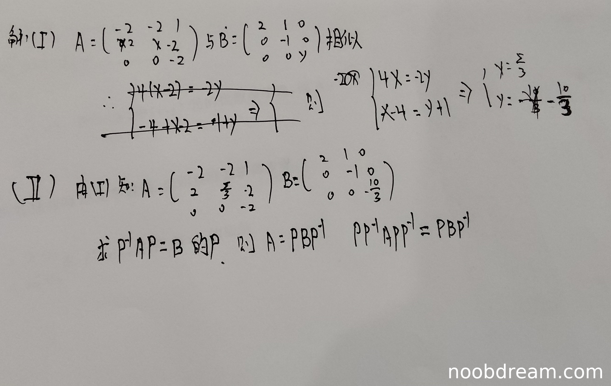 由于第(I)问已经得出错误的x,y值,导致第(II)问中使用的矩阵A和B都是错误的。虽然学生知道需要找到可逆矩阵P使得P⁻¹AP=B,但在错误的基础上无法得到正确答案。且解答过程中存在明显的逻辑错误(如PP⁻¹APP⁻¹=PBP⁻¹这种无意义的推导)。因此扣6分。