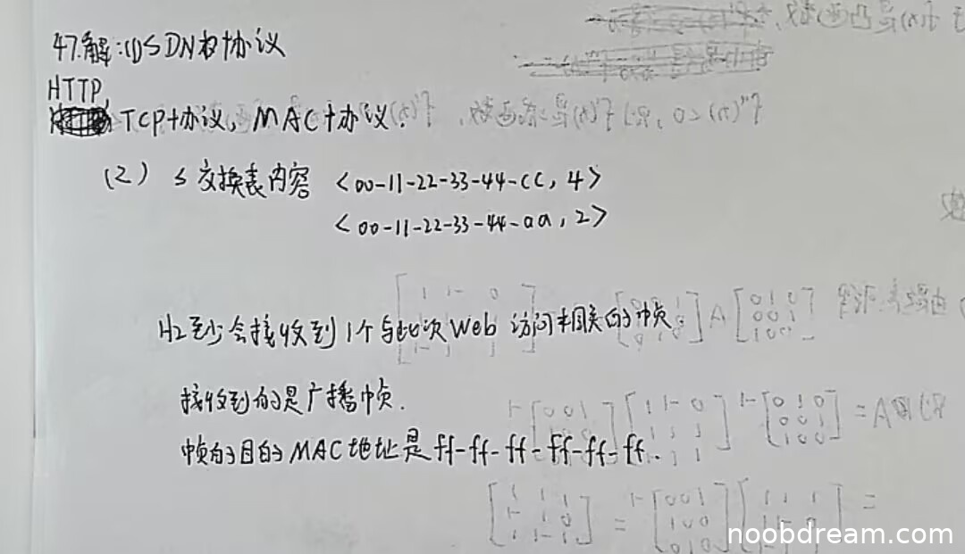 学生回答中提到了"SDN协议"或"5DN协议",这可能是识别错误,应为"DNS协议"。但学生正确指出了HTTP和TCP协议,并提到了MAC协议(虽然标准答案更准确地描述为CSMA/CD帧)。由于核心应用层协议DNS未正确识别,但封装协议基本正确,扣1分。得2分。