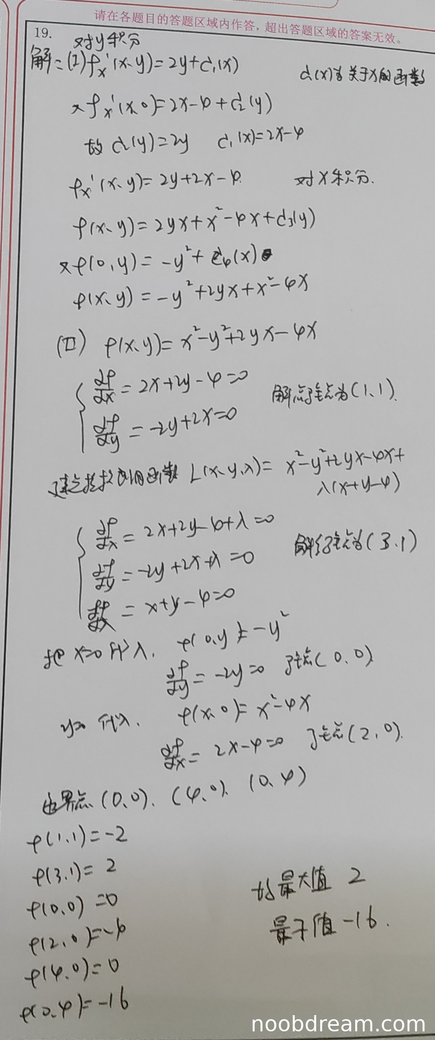 第(Ⅱ)问中,学生正确求出驻点 (1,1),在边界 \( x+y=4 \) 上使用拉格朗日乘数法得到 (3,1),在边界 \( x=0 \) 和 \( y=0 \) 上分别求出 (0,0) 和 (2,0),并列出所有边界交点 (0,0)、(4,0)、(0,4)。最后正确计算各点函数值并比较得出最大值2和最小值-16。整个过程逻辑完整,计算正确。因此得6分(满分6分)。