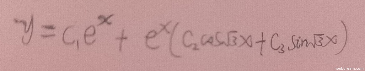 该题考查三阶常系数线性微分方程的通解求解。标准方程为 \(y^{\prime \prime \prime}-y=0\),其特征方程为 \(r^3 - 1 = 0\),解得特征根为 \(r_1 = 1\),\(r_2 = -\frac{1}{2} + \frac{\sqrt{3}}{2}i\),\(r_3 = -\frac{1}{2} - \frac{\sqrt{3}}{2}i\)。因此通解应为 \(y = c_1 e^x + e^{-\frac{x}{2}}(c_2 \cos\frac{\sqrt{3}}{2}x + c_3 \sin\frac{\sqrt{3}}{2}x)\)。
