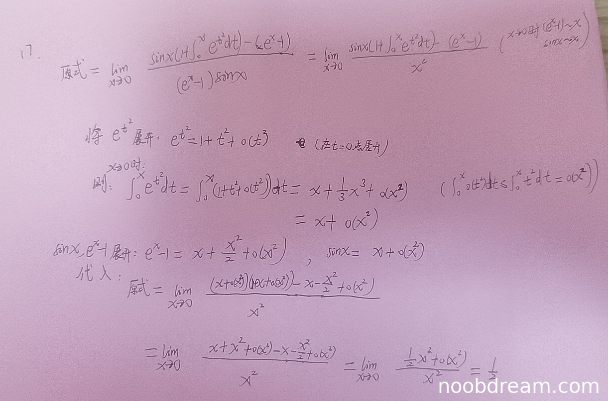 - 在展开 \(\int_0^x e^{t^2} dt\) 时,学生得到 \(x + \frac{1}{3}x^3 + o(x^2)\),但随后简化为 \(x + o(x^2)\),这里忽略了 \(\frac{1}{3}x^3\) 项,虽然最终结果正确,但展开精度不够严谨。